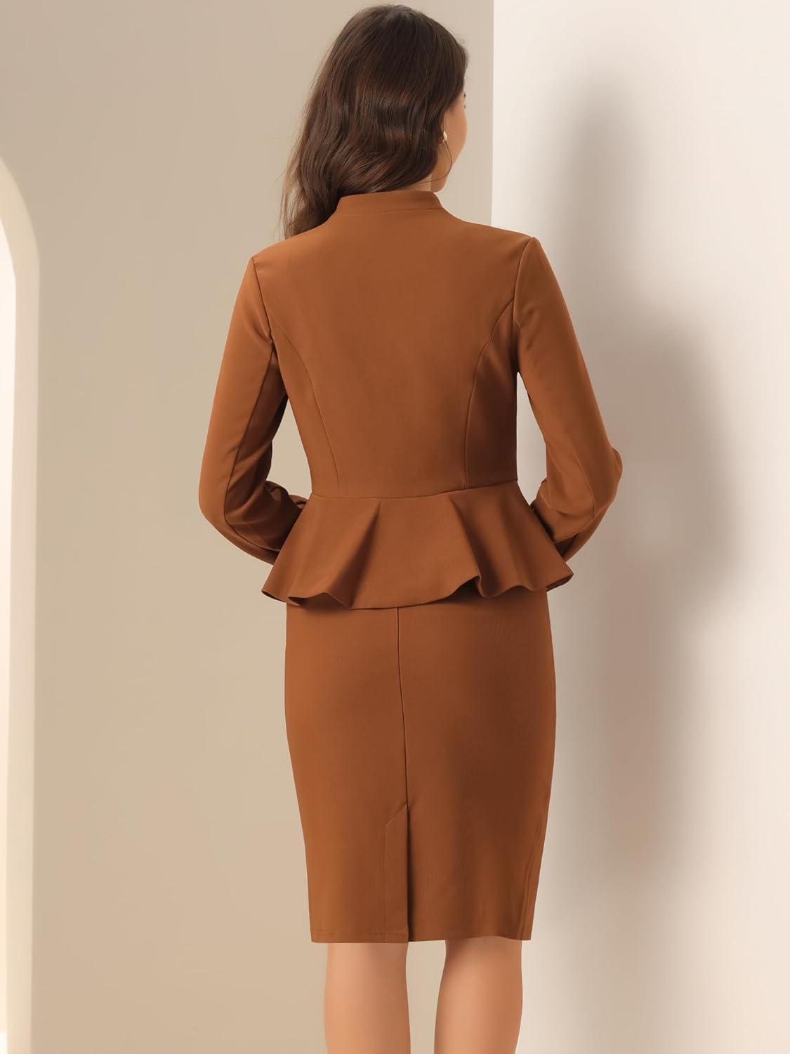 Allegra K 2 Piece Skirt Sets for Women Long Sleeve Blazer and Pencil Skirt Business Suits(Brown)