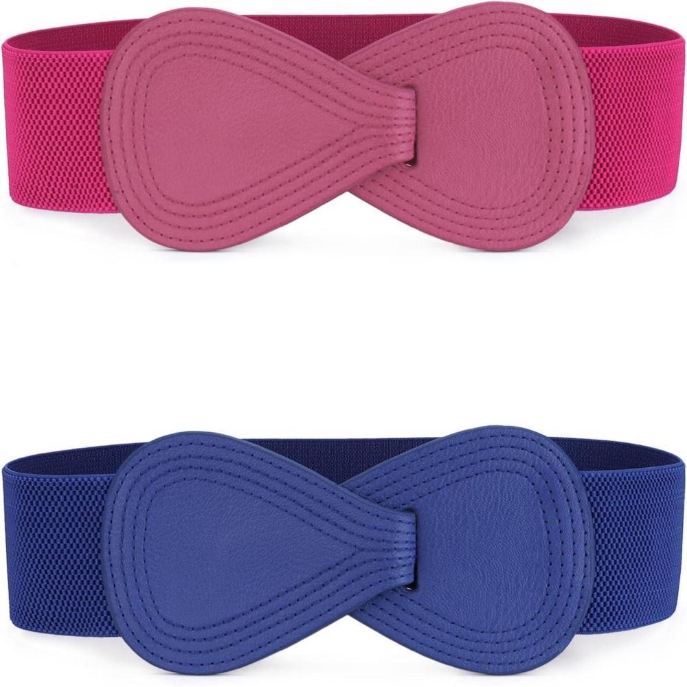 Allegra K 2Pcs Women Plus Size Elastic Belt Interlock 8-Shaped Buckle Stretch Waistband Belts for Dress(Blue & Rose Red)