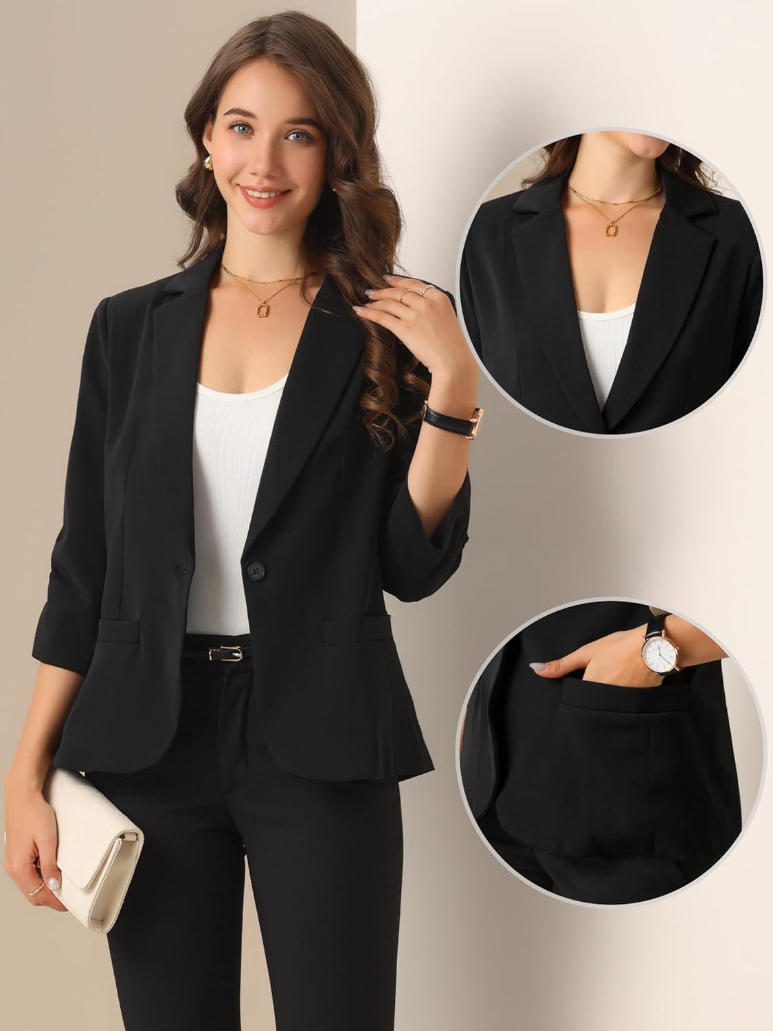 Allegra K Blazers for Women’s Open Front Casual Outfits Work Office Suit Jackets Ruched 3/4 Sleeve Blazer(Black)