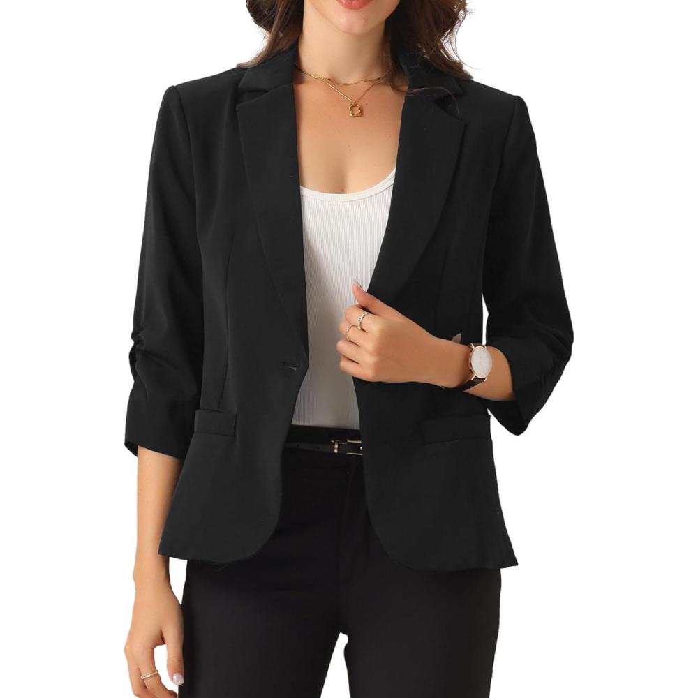 Allegra K Blazers for Women's Open Front Casual Outfits Work Office Suit Jackets Ruched 3/4 Sleeve Blazer(Black)