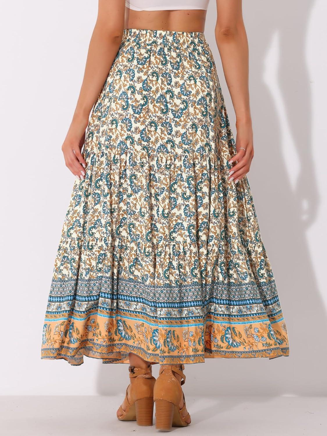 imageAllegra K Boho Skirt for Womens Casual Peasant Floral Bohemian Tassels Elastic Waist Maxi SkirtsBlue