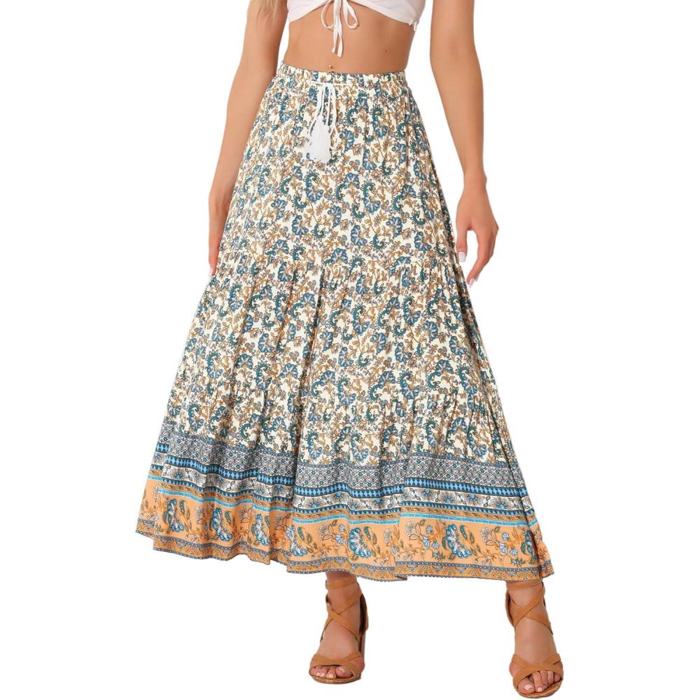imageAllegra K Boho Skirt for Womens Casual Peasant Floral Bohemian Tassels Elastic Waist Maxi SkirtsBeige