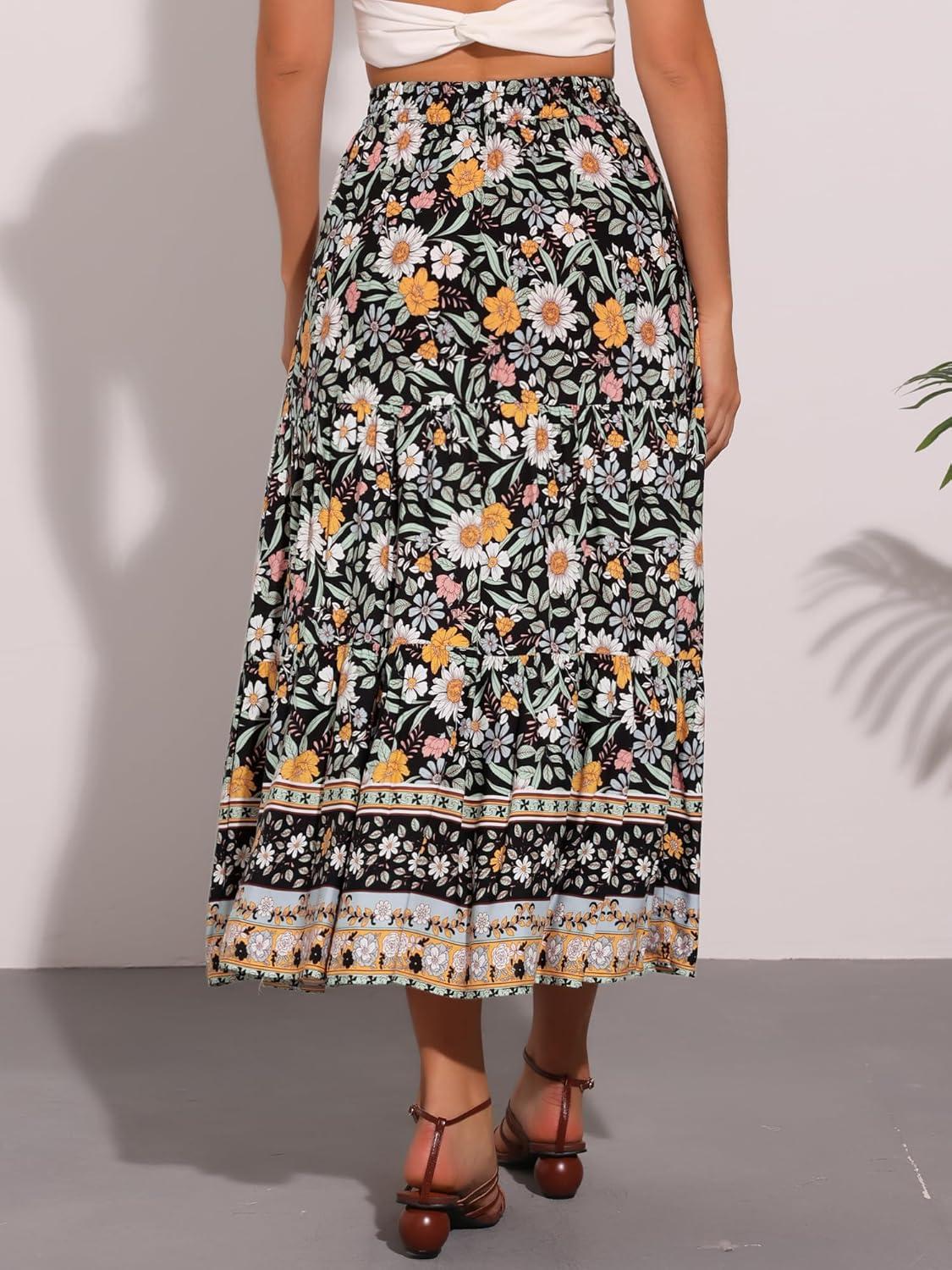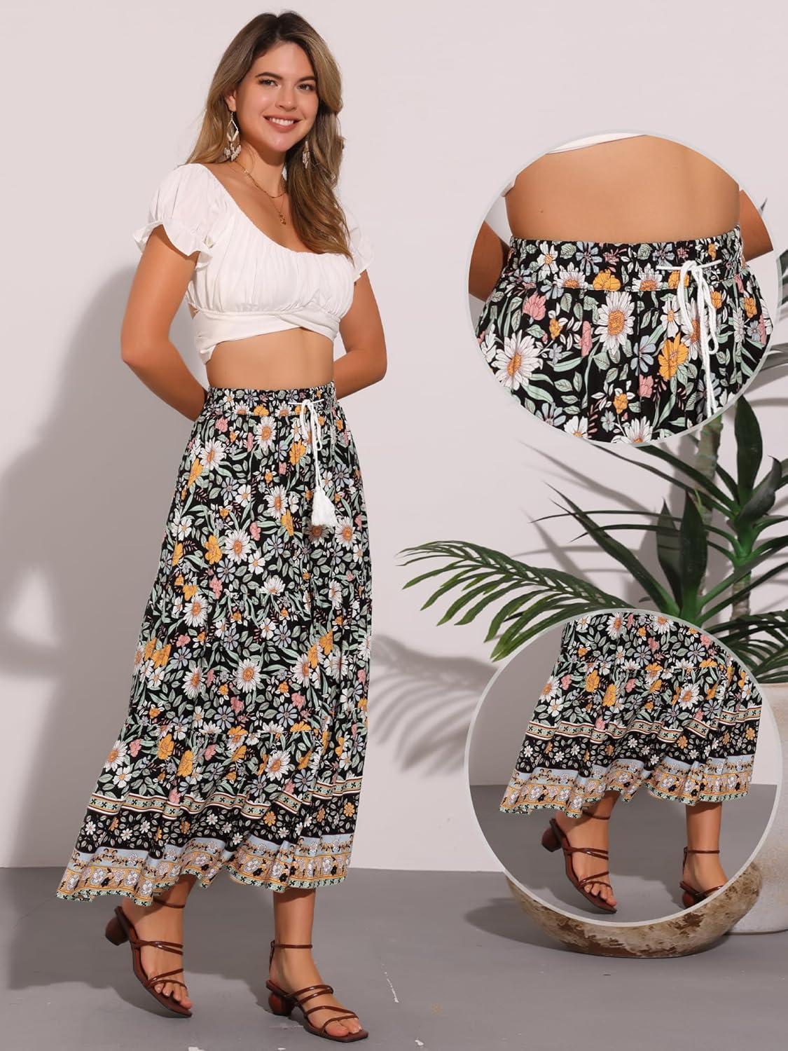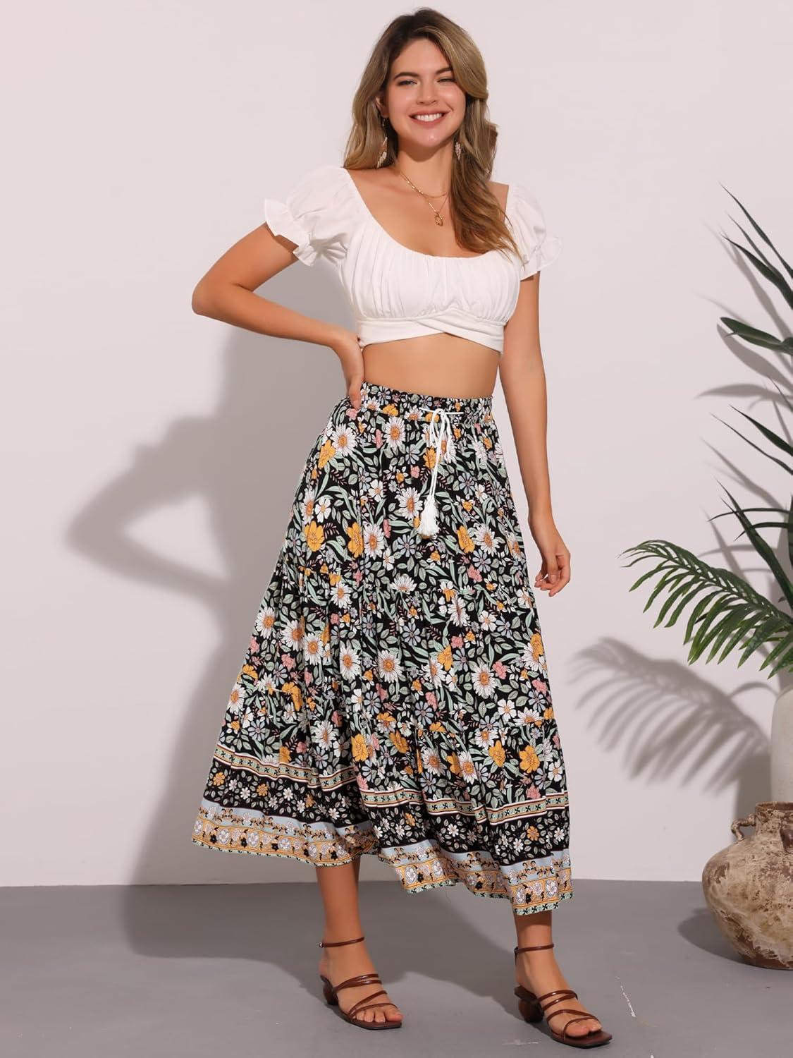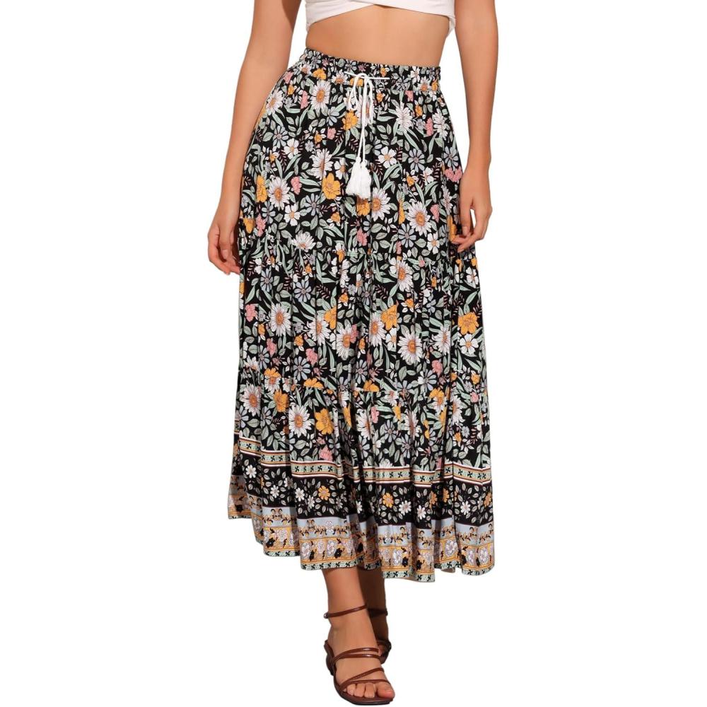 Allegra K Boho Skirt for Women’s Casual Peasant Floral Bohemian Tassels Elastic Waist Maxi Skirts(Black)