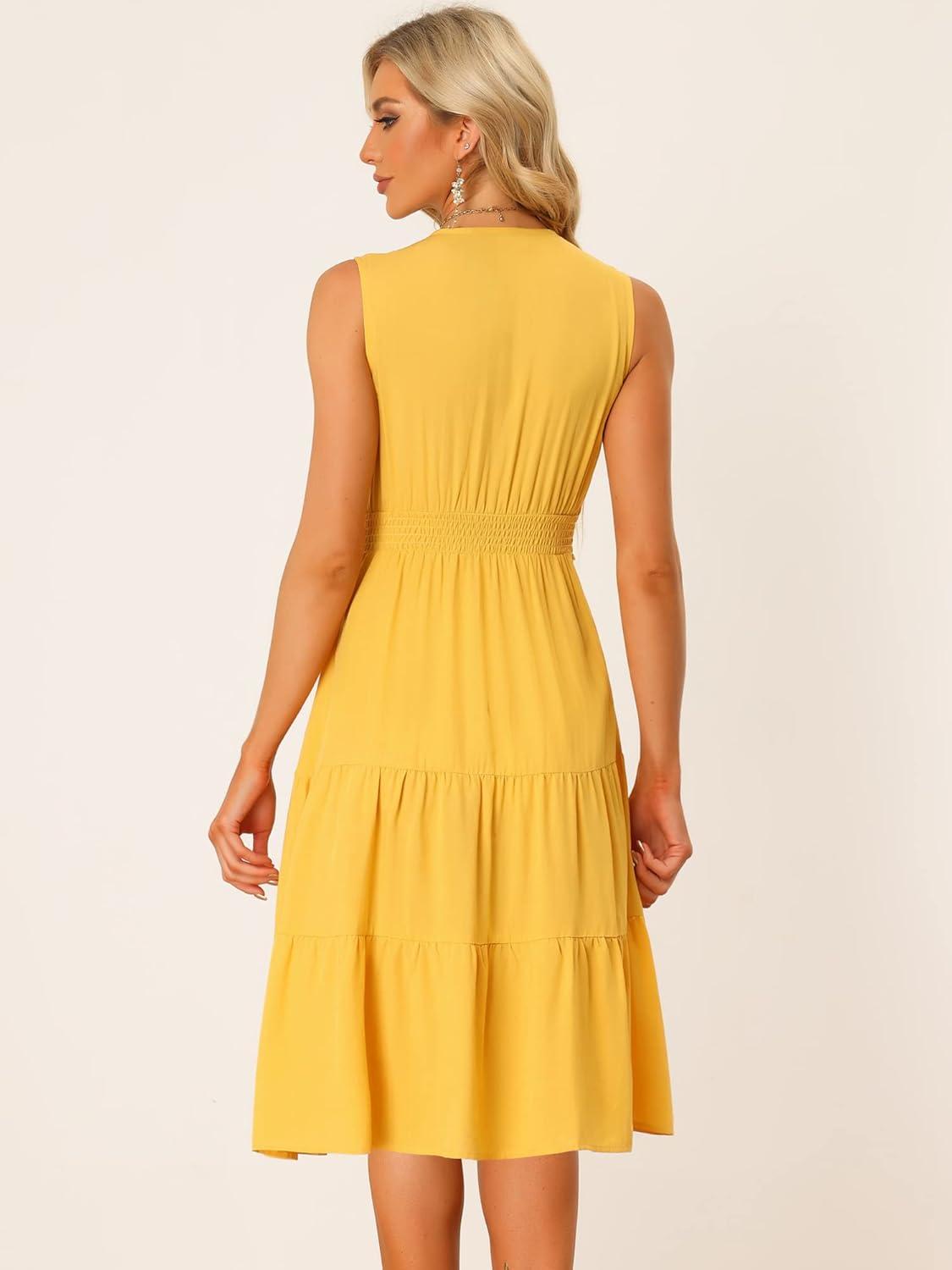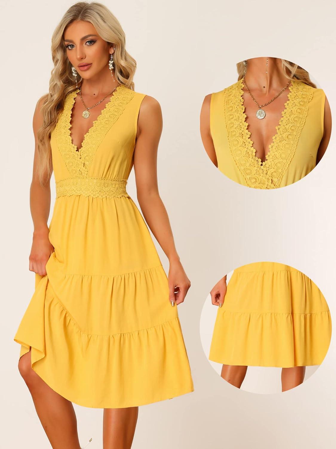 Allegra K Boho Sleeveless Dress for Women's Lace Trim Beach Tiered V Neck Midi Sundress(Yellow)