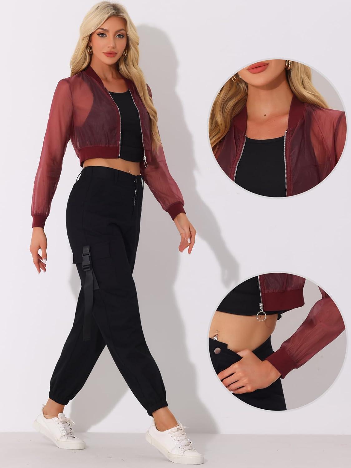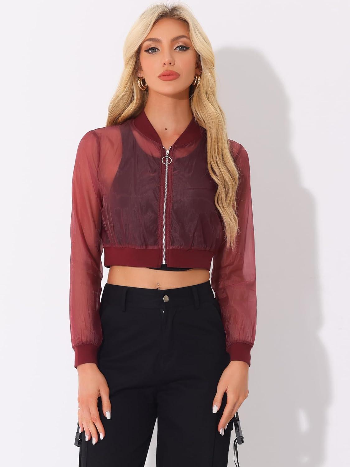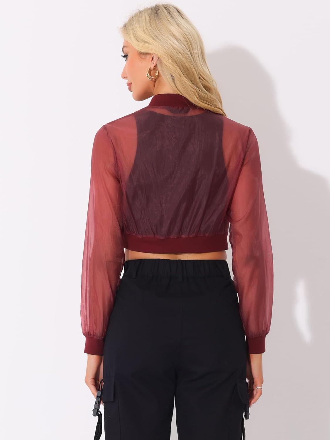 Allegra K Bomber Crop Jacket for Women’s Sheer Mesh Lightweight Long Sleeve Jackets(Burgundy)