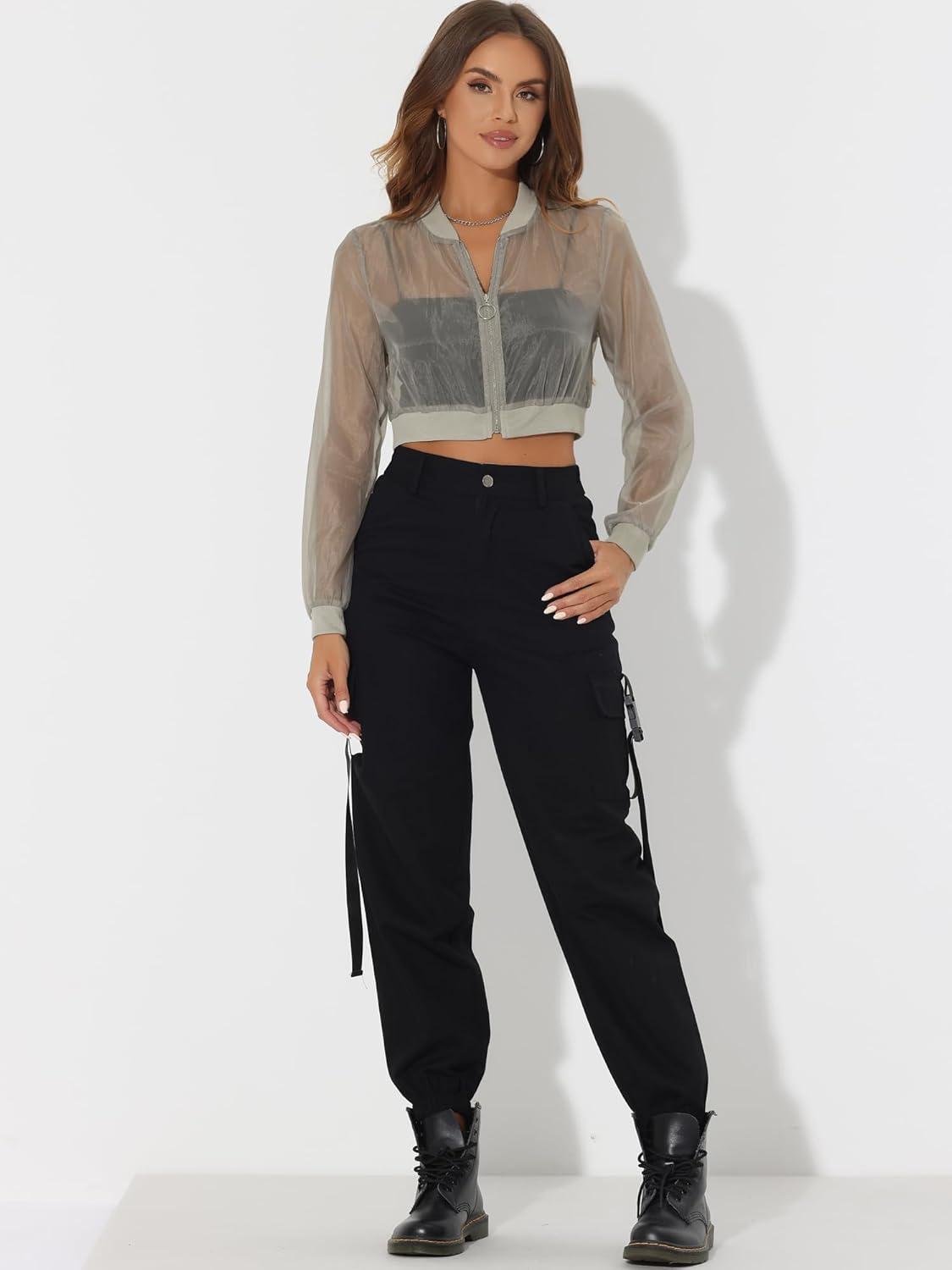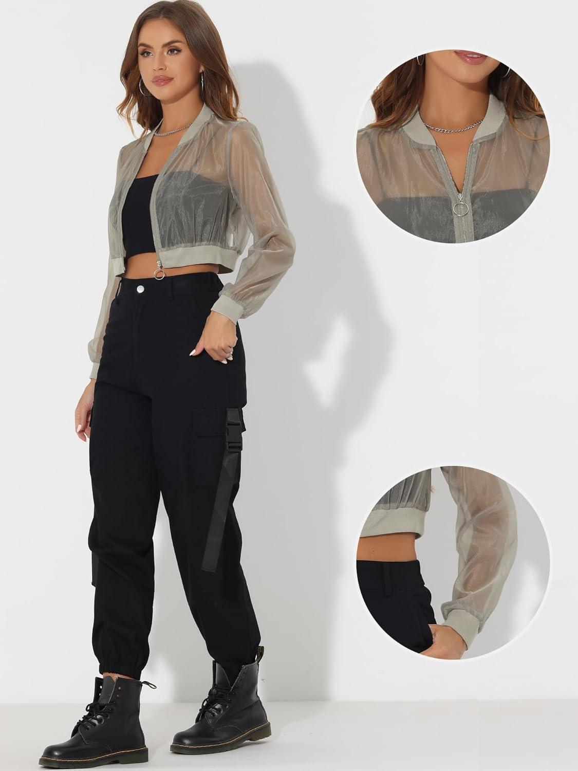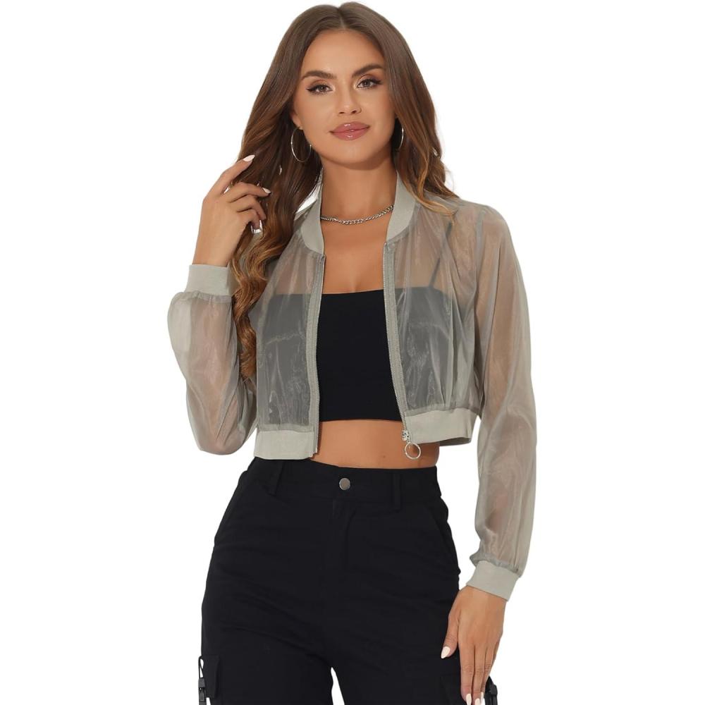 Allegra K Bomber Crop Jacket for Women’s Sheer Mesh Lightweight Long Sleeve Jackets(Grey)