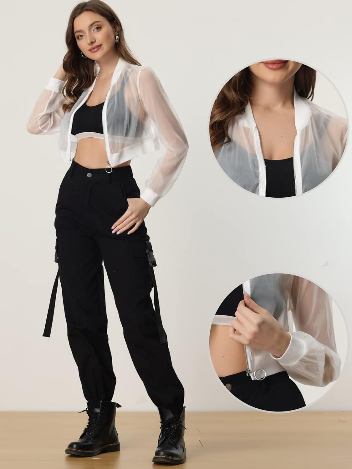 imageAllegra K Bomber Crop Jacket for Womens Sheer Mesh Lightweight Long Sleeve JacketsWhite