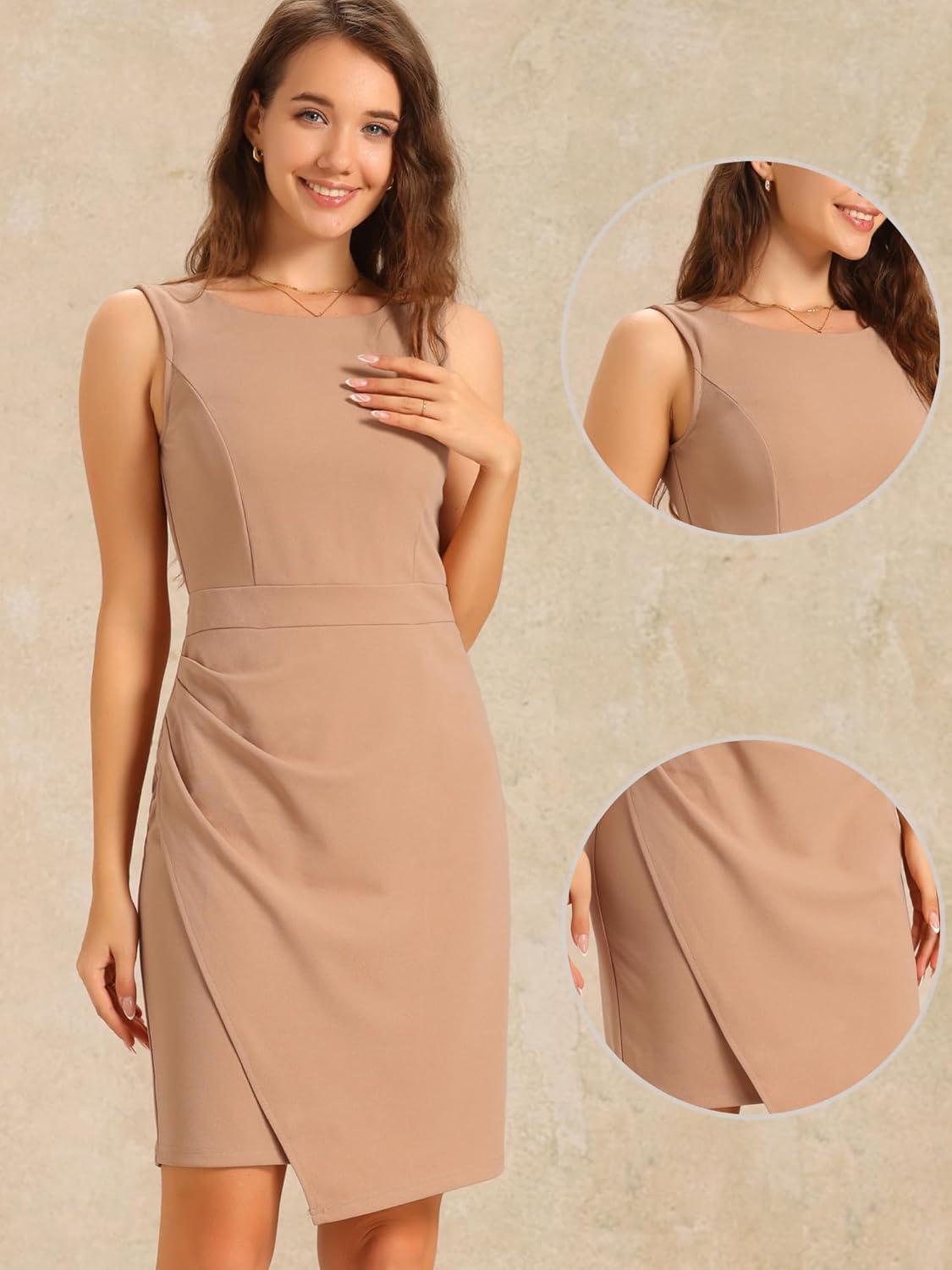 Allegra K Business Casual Dress for Women’s Boat Neck Sleeveless Ruched Office Summer Pencil Dresses(Khaki)
