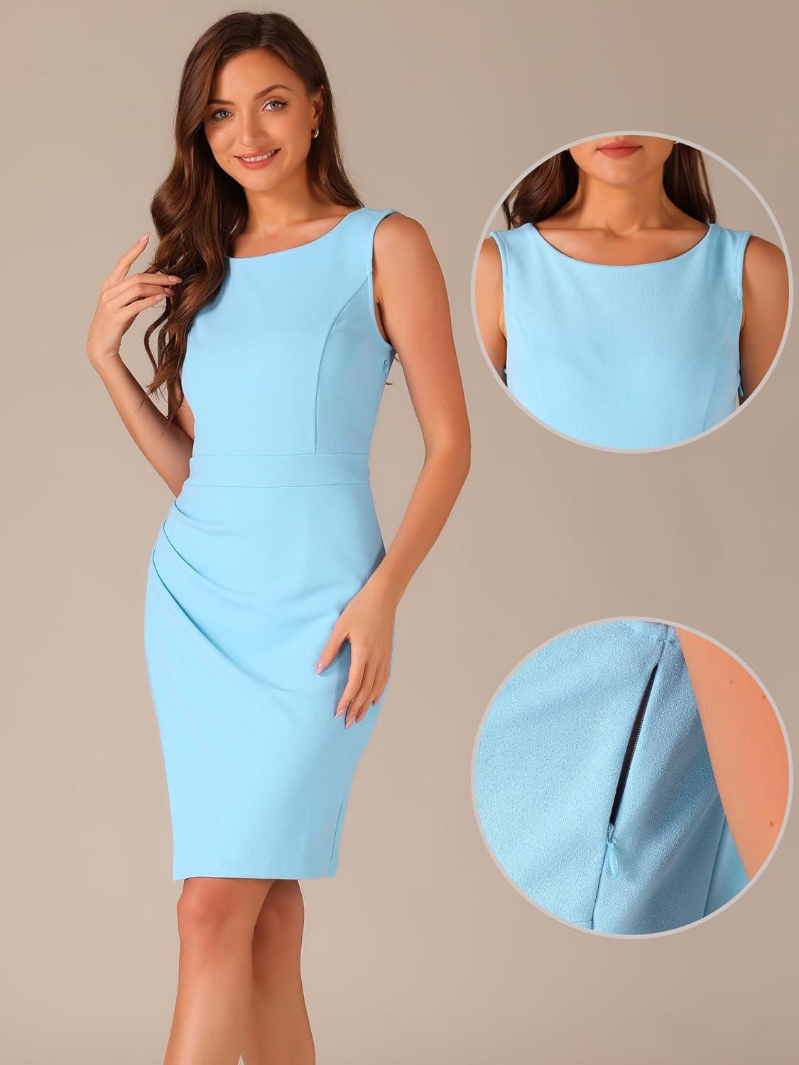 Allegra K Business Casual Dress for Women's Boat Neck Sleeveless Ruched Office Summer Pencil Dresses(Sky Blue)