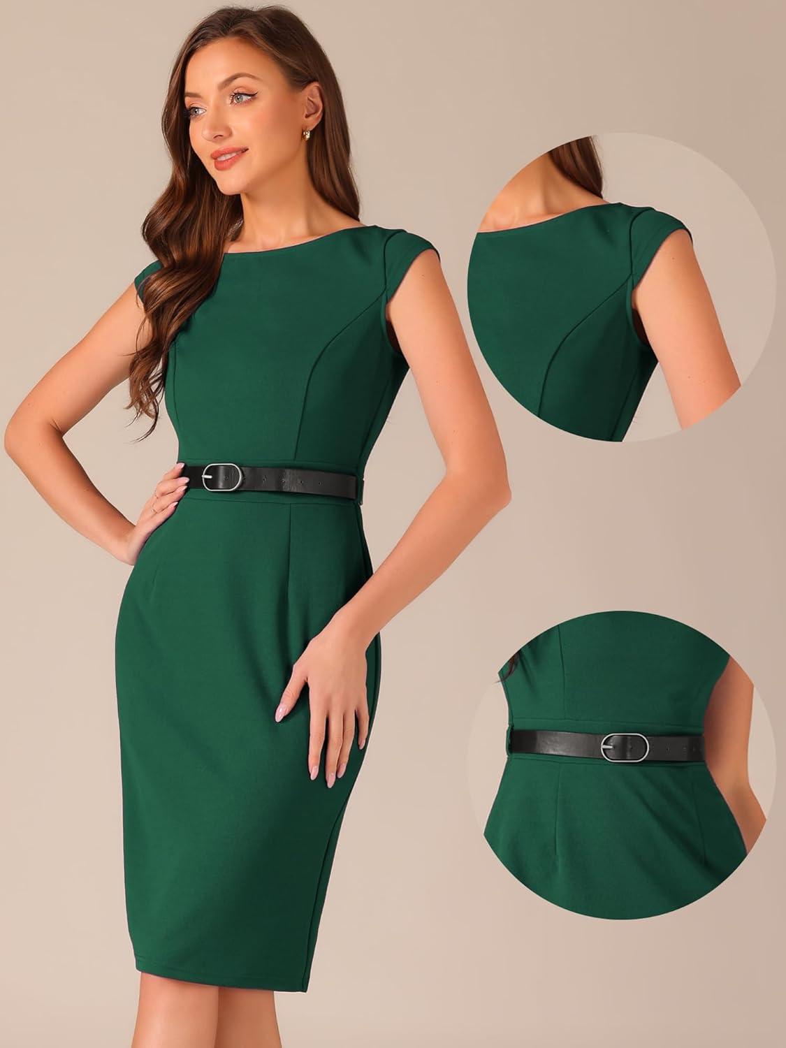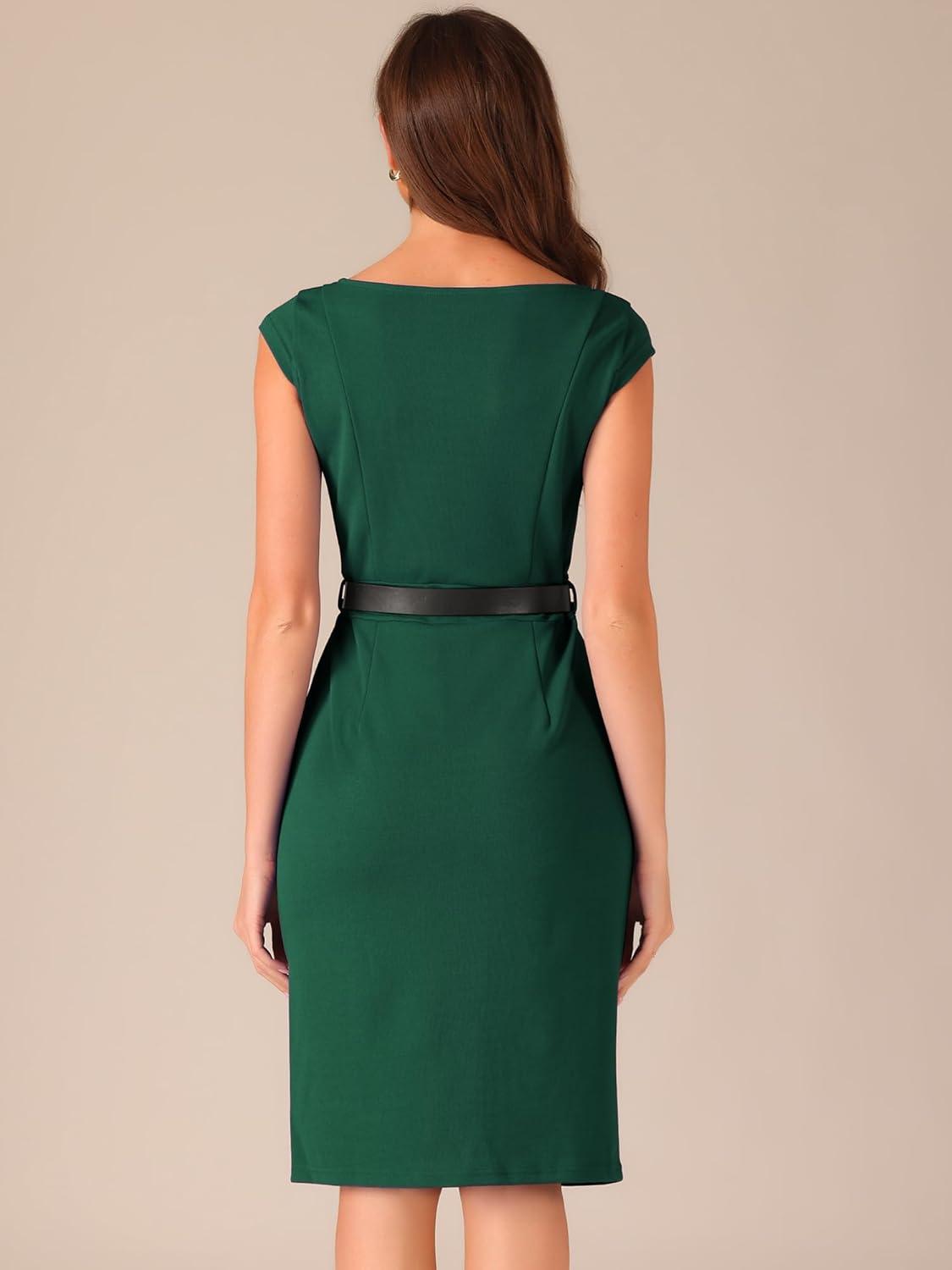 Allegra K Business Casual Dress for Women’s Cap Sleeve Boat Neck Belted Pencil Dress(Dark Green)