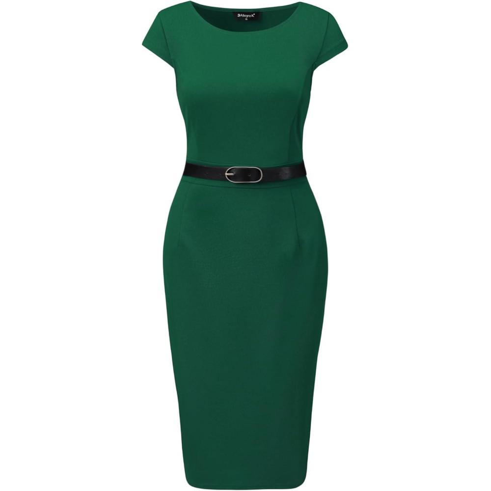 Allegra K Business Casual Dress for Women's Cap Sleeve Boat Neck Belted Pencil Dress(Dark Green)