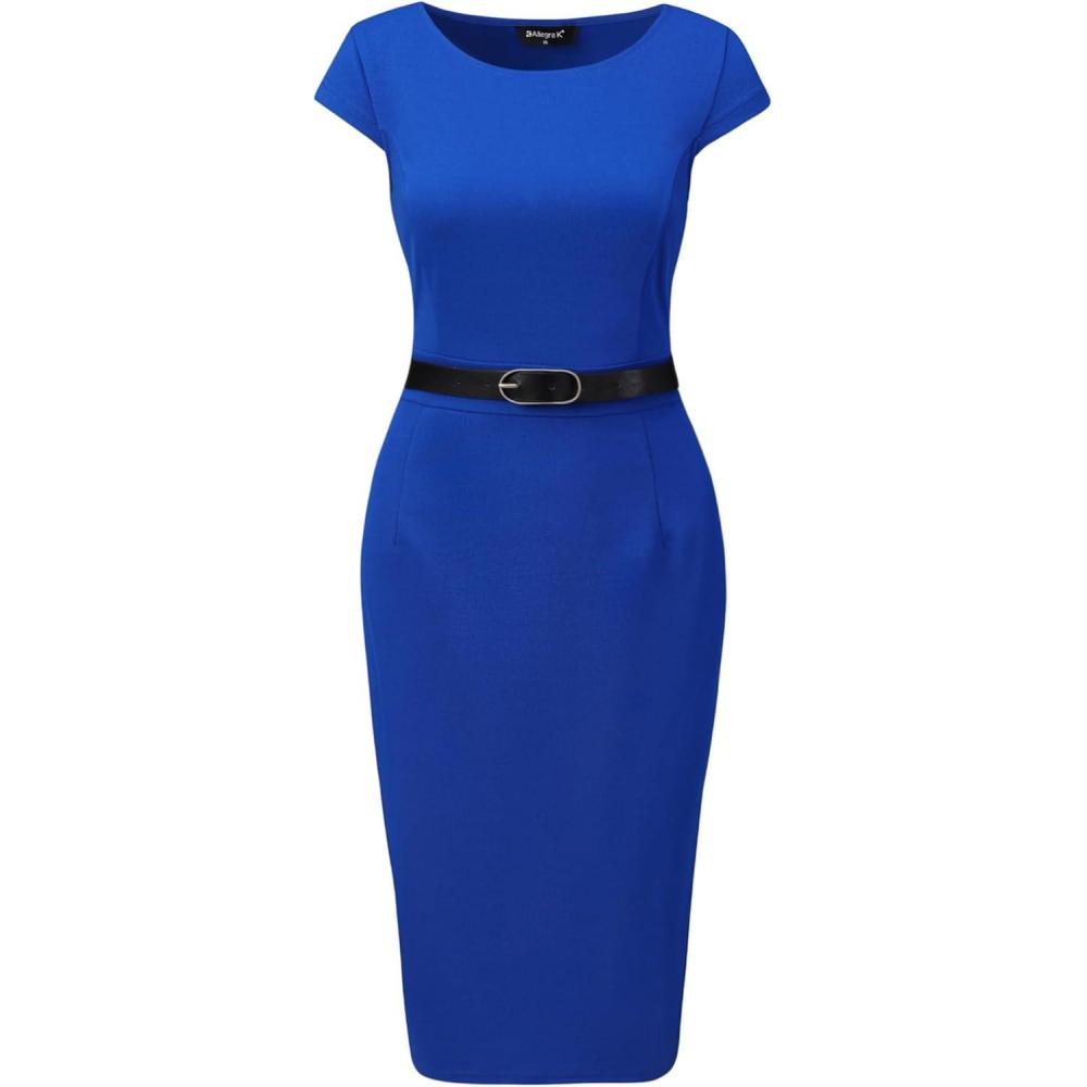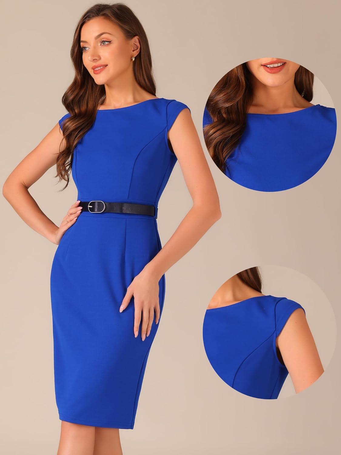 Allegra K Business Casual Dress for Women’s Cap Sleeve Boat Neck Belted Pencil Dress(Royal Blue)