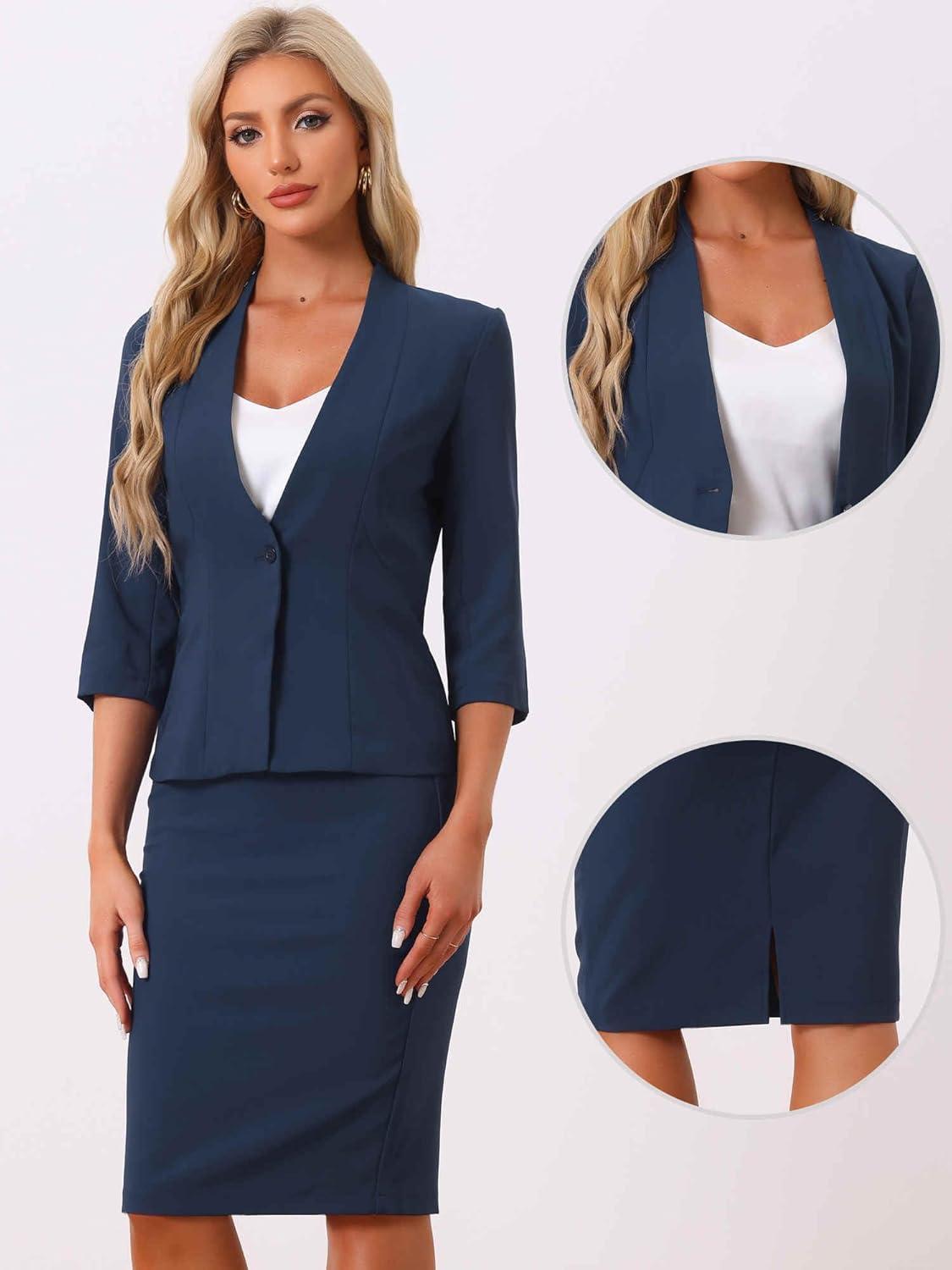 Allegra K Business Skirt Suit Set for Women's 2 Piece Office Work Outfit Collarless Blazer Pencil Skirt(Navy Blue)