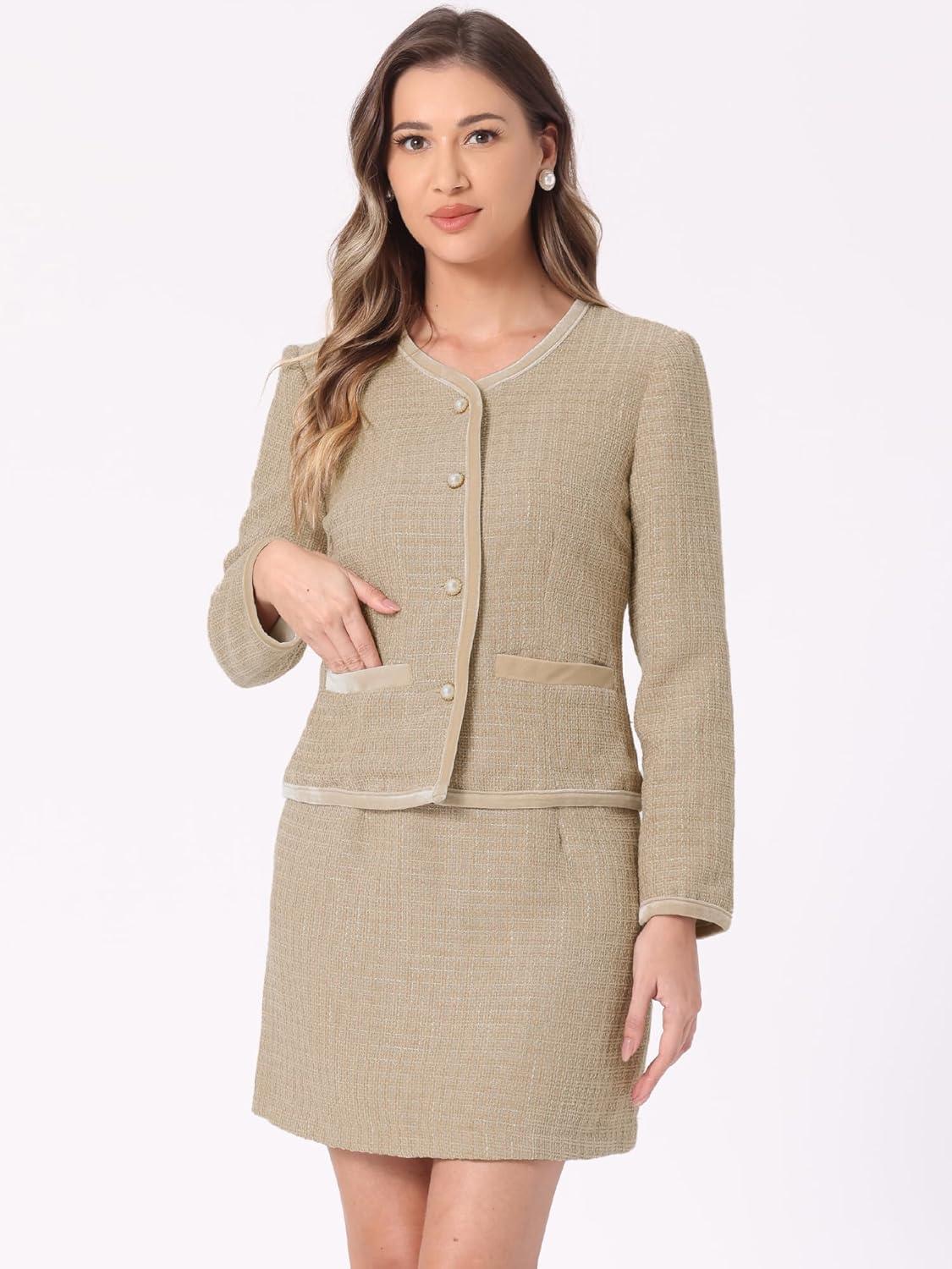 Allegra K Business Suit Set for Women's 2 Piece Outfits Plaid Tweed Easter Short Blazer Jacket and Skirt Sets(Khaki)