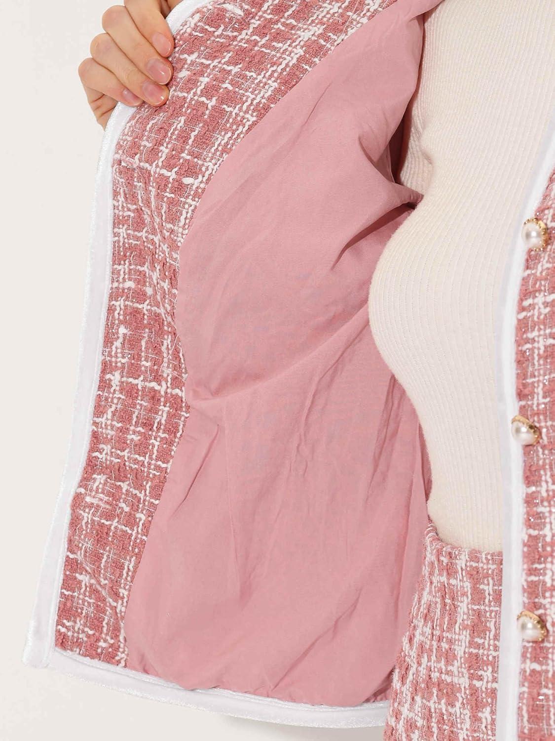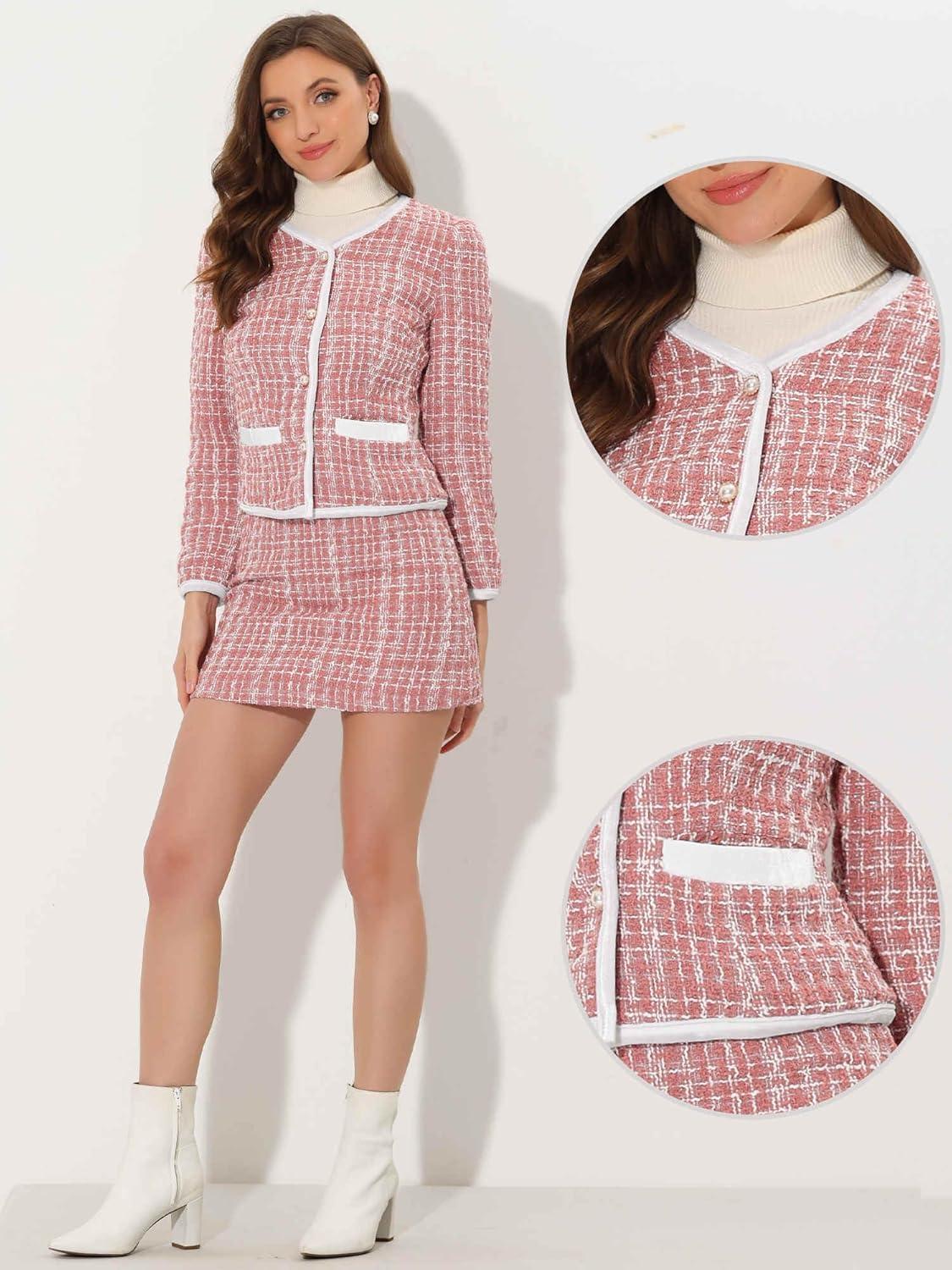 Allegra K Business Suit Set for Women's 2 Piece Outfits Plaid Tweed Easter Short Blazer Jacket and Skirt Sets(Pink)