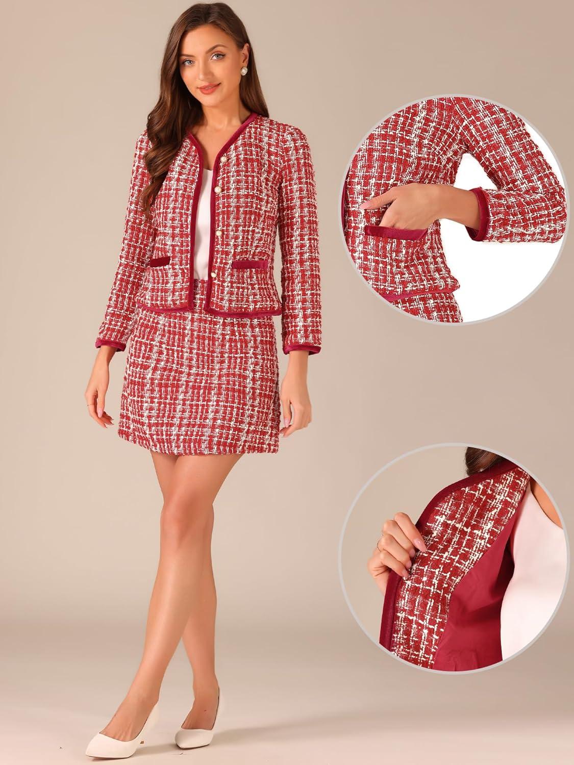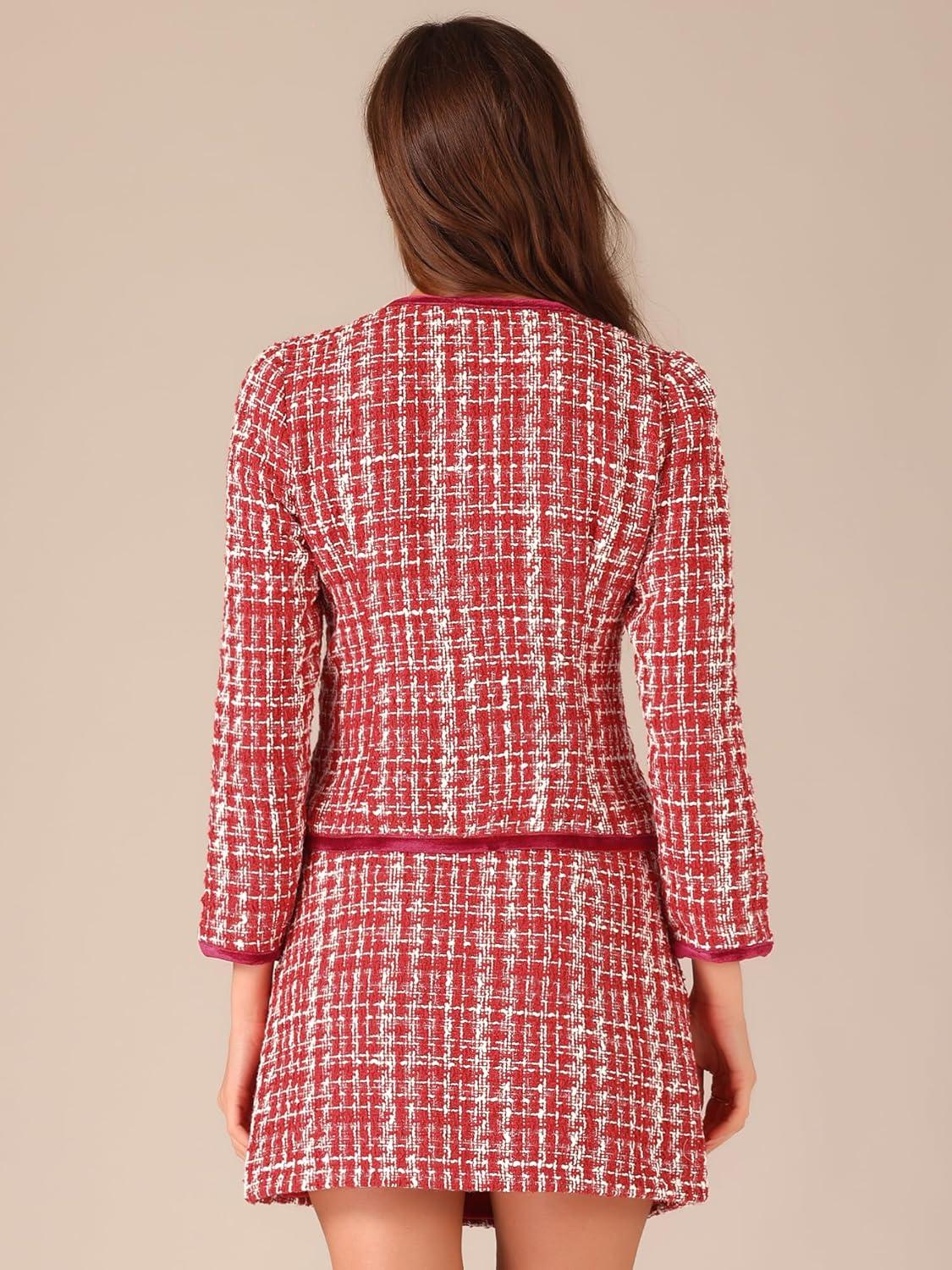 Allegra K Business Suit Set for Women's 2 Piece Outfits Plaid Tweed Easter Short Blazer Jacket and Skirt Sets(Red)