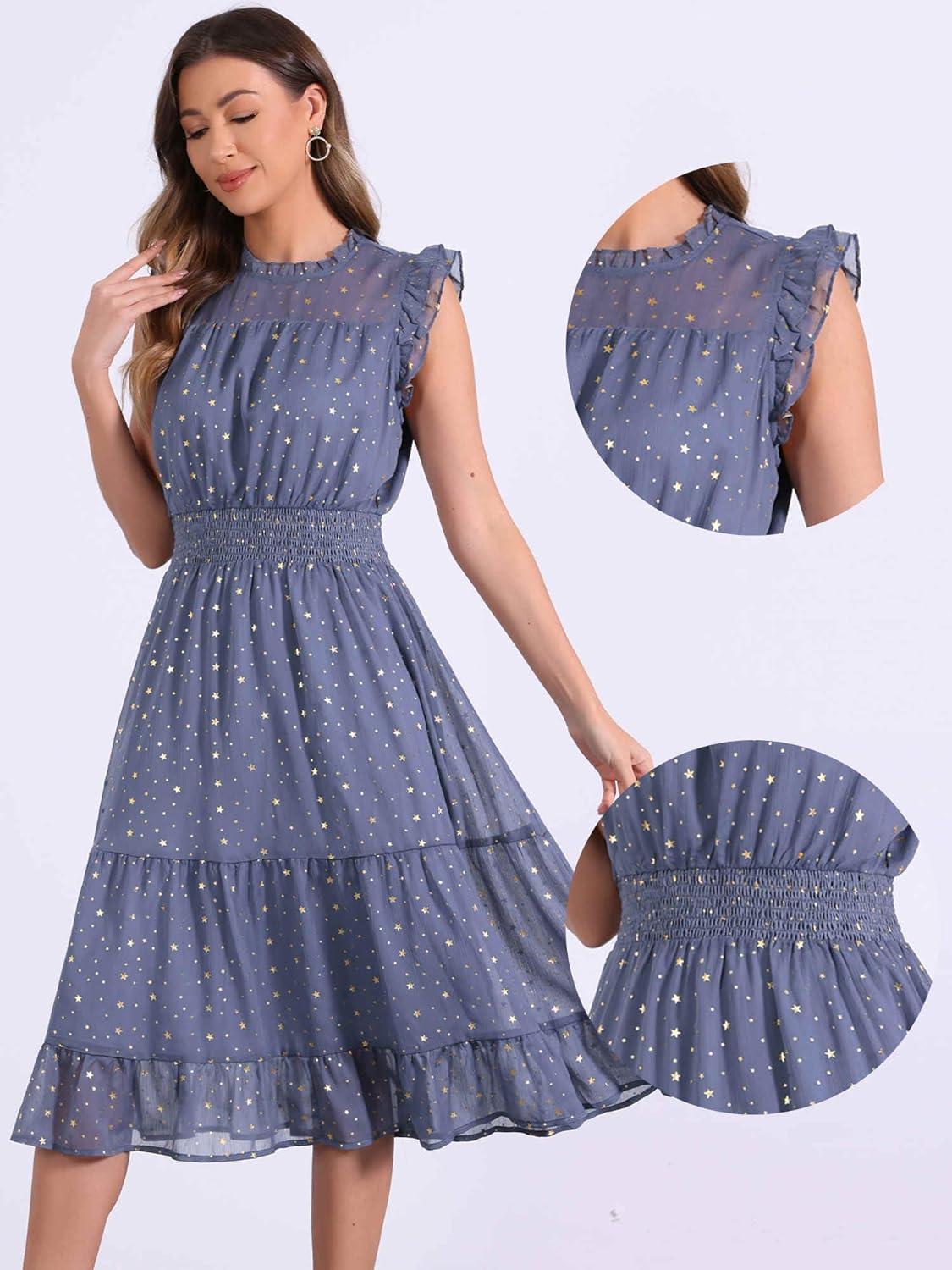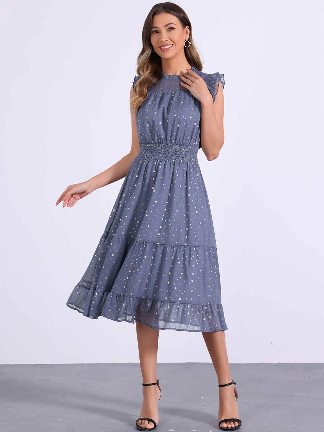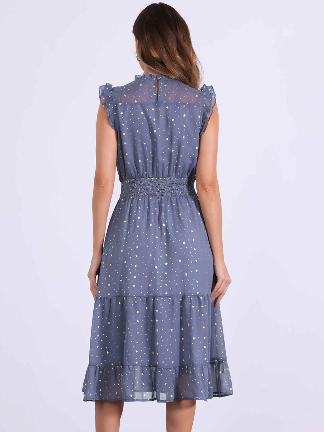 Allegra K Casual Chiffon Midi Dress for Women Halloween Sleeveless Smocked Waist Gilding Metallic Stars Party Dresses(Grey Blue)