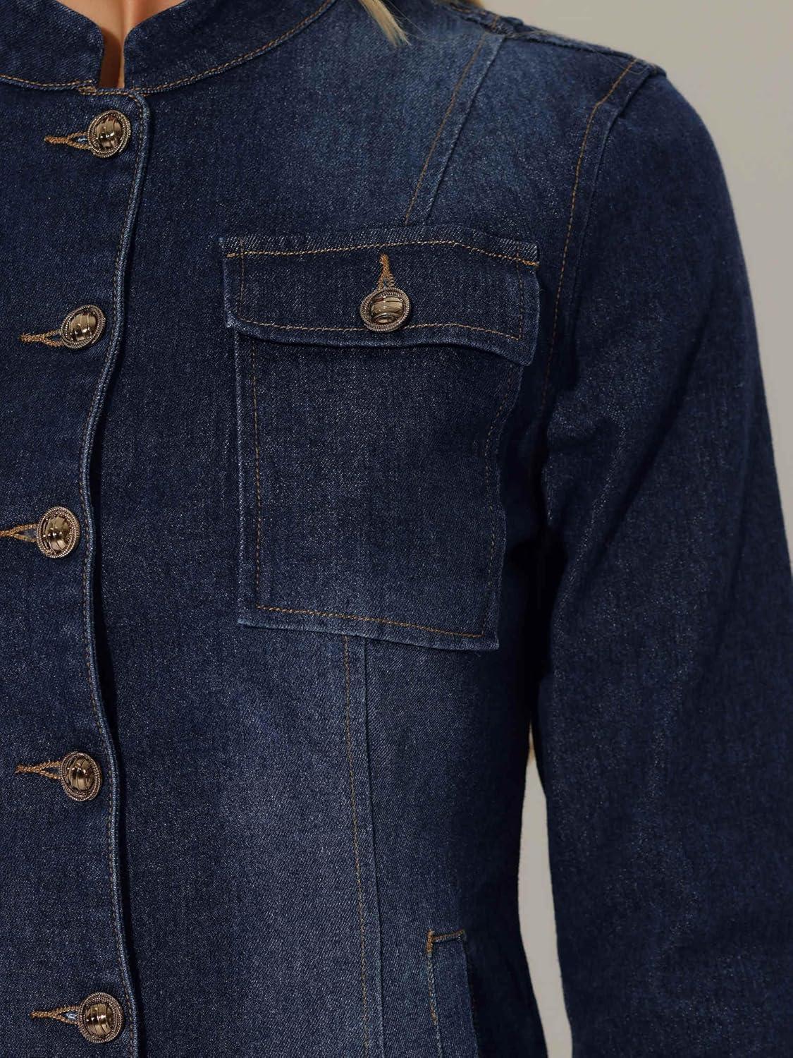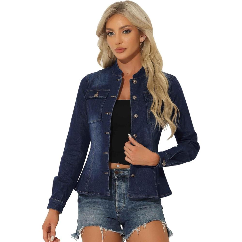 Allegra K Casual Denim Jacket for Women’s Classic Stand Collar Long Sleeve Jean Jacket(Dark Blue)