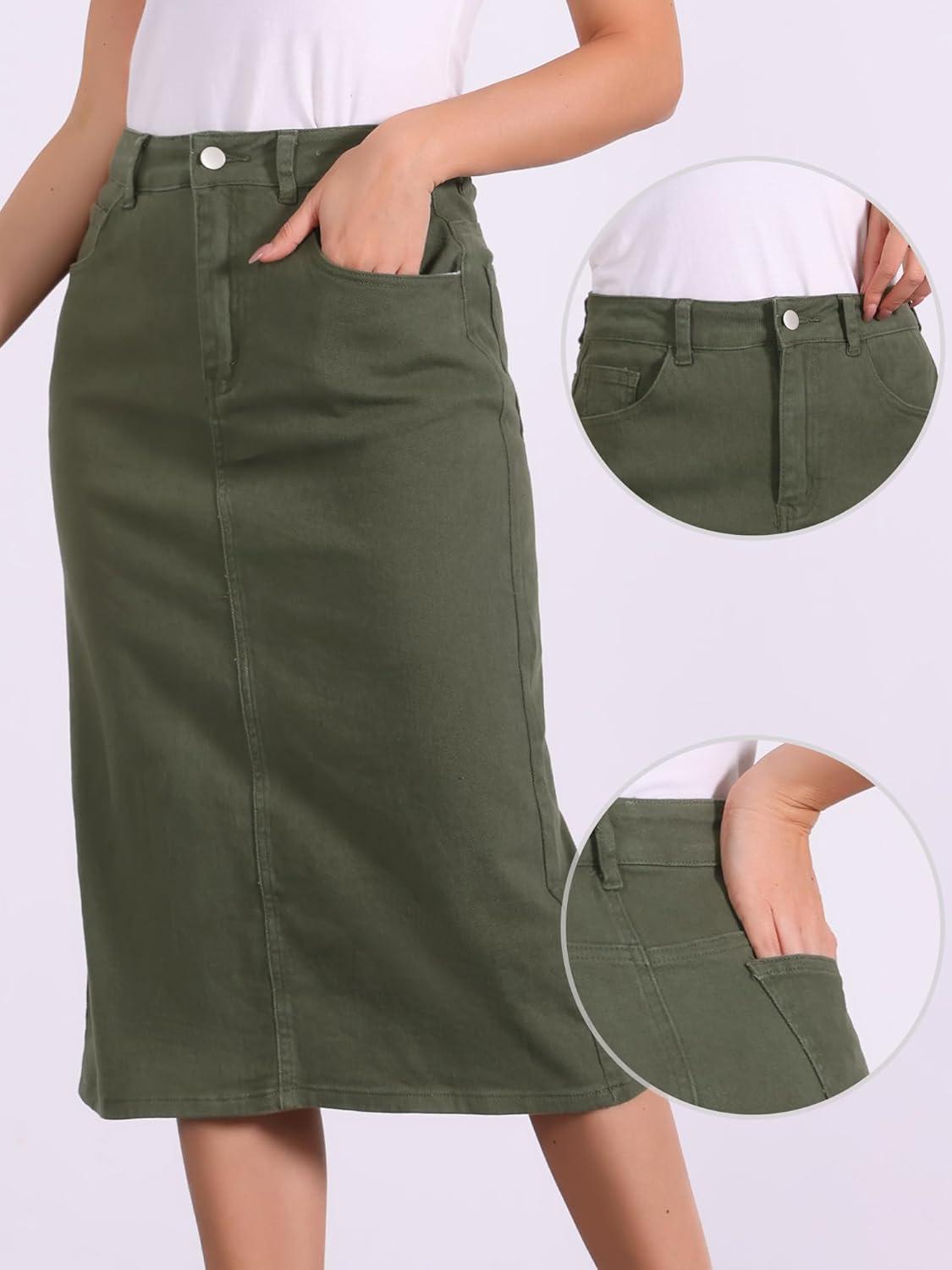 Allegra K Casual Denim Skirt for Women’s High Waist Split Back Pockets Midi Jean Skirts(Army Green)