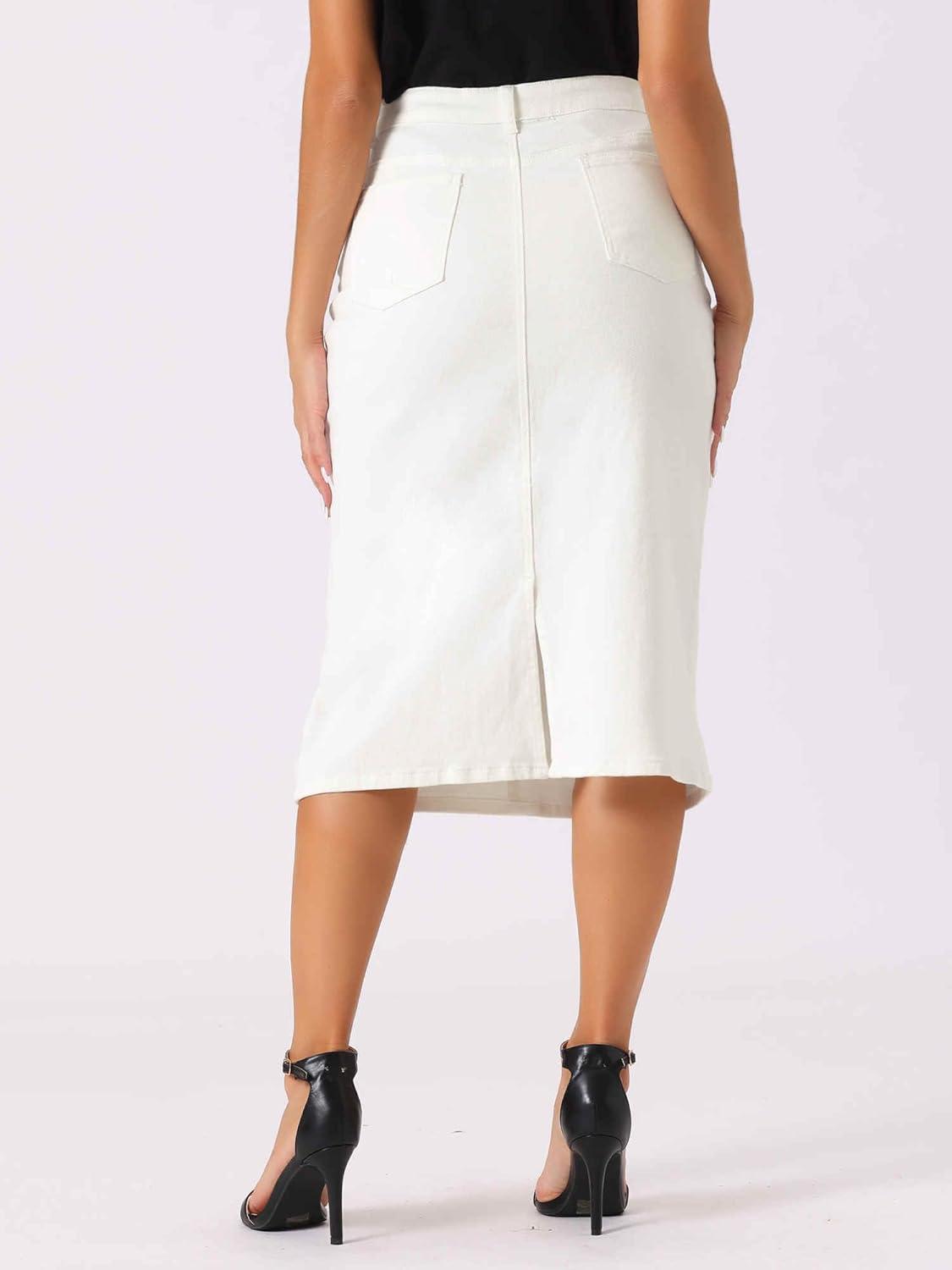Allegra K Casual Denim Skirt for Women’s High Waist Split Back Pockets Midi Jean Skirts(Cream White)