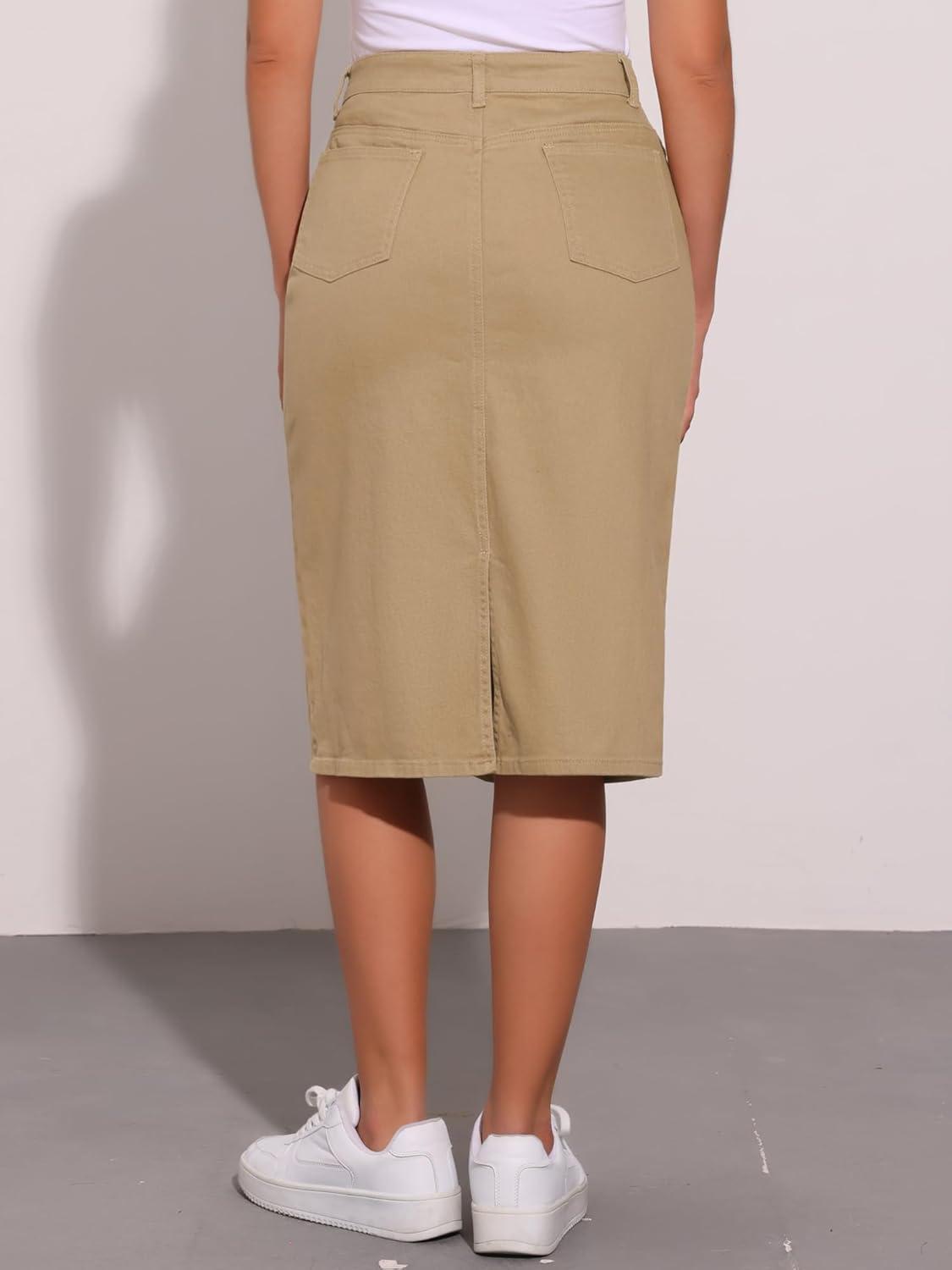 Allegra K Casual Denim Skirt for Women’s High Waist Split Back Pockets Midi Jean Skirts(Khaki)