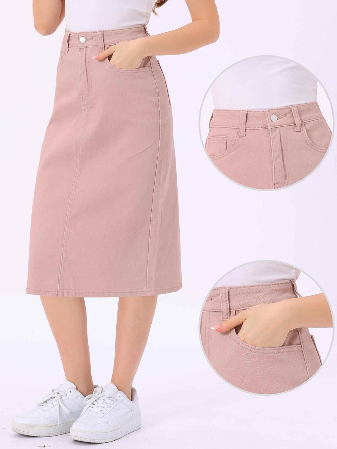 Allegra K Casual Denim Skirt for Women's High Waist Split Back Pockets Midi Jean Skirts(Pink)