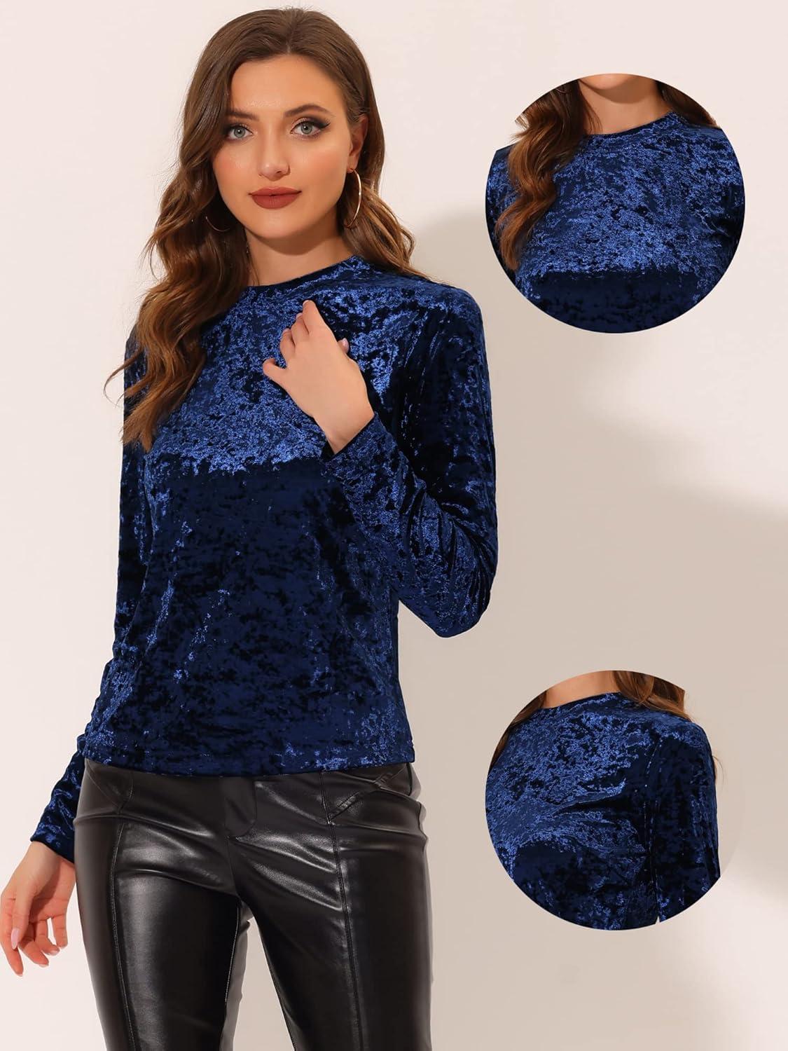 Allegra K Casual Velvet Top for Women’s Soft Vintage Crew Neck Long Sleeve Christmas T-Shirt(Dark Blue)
