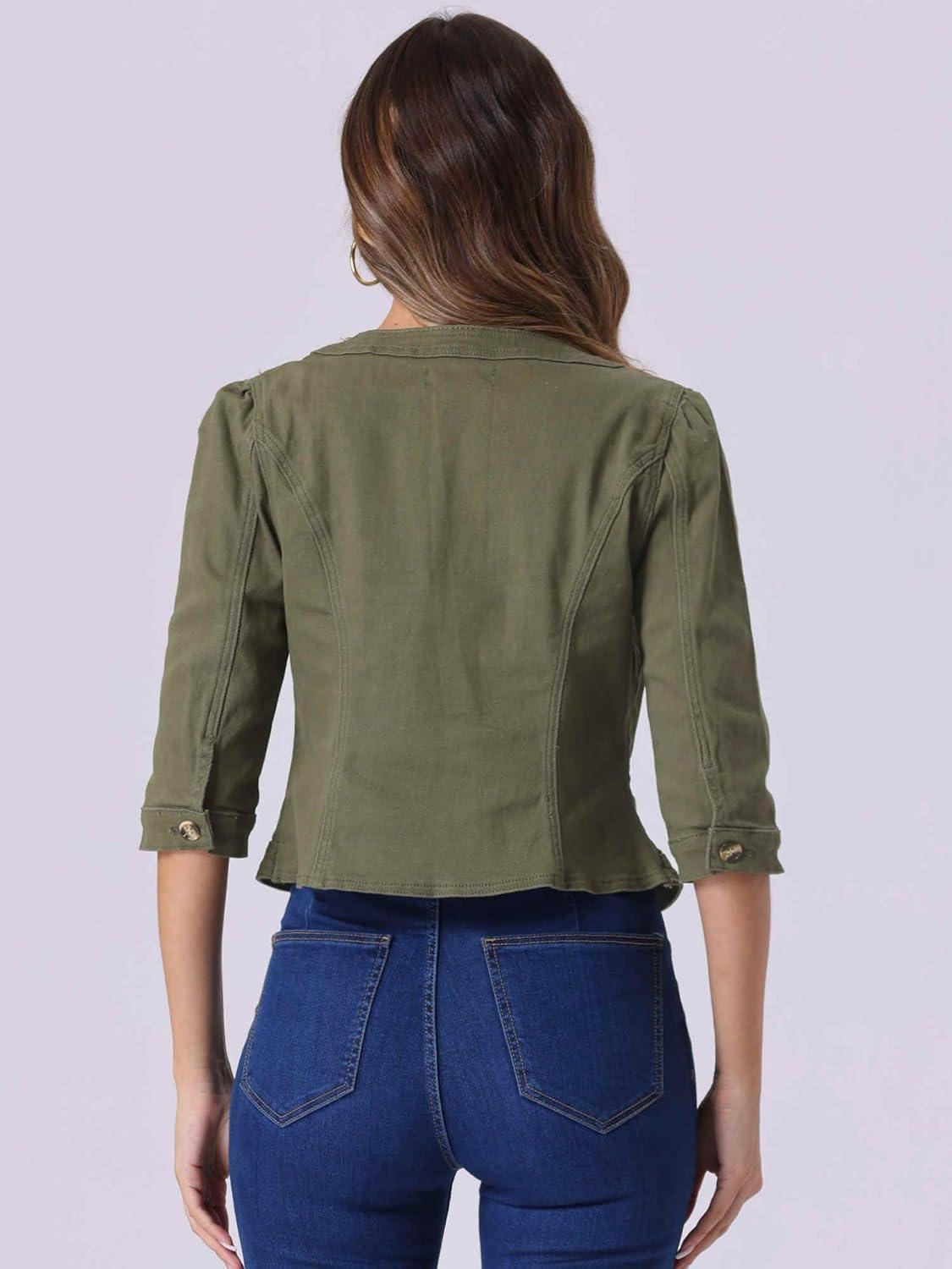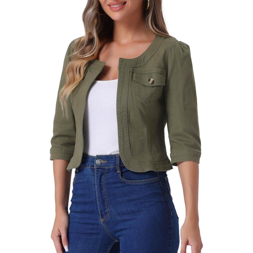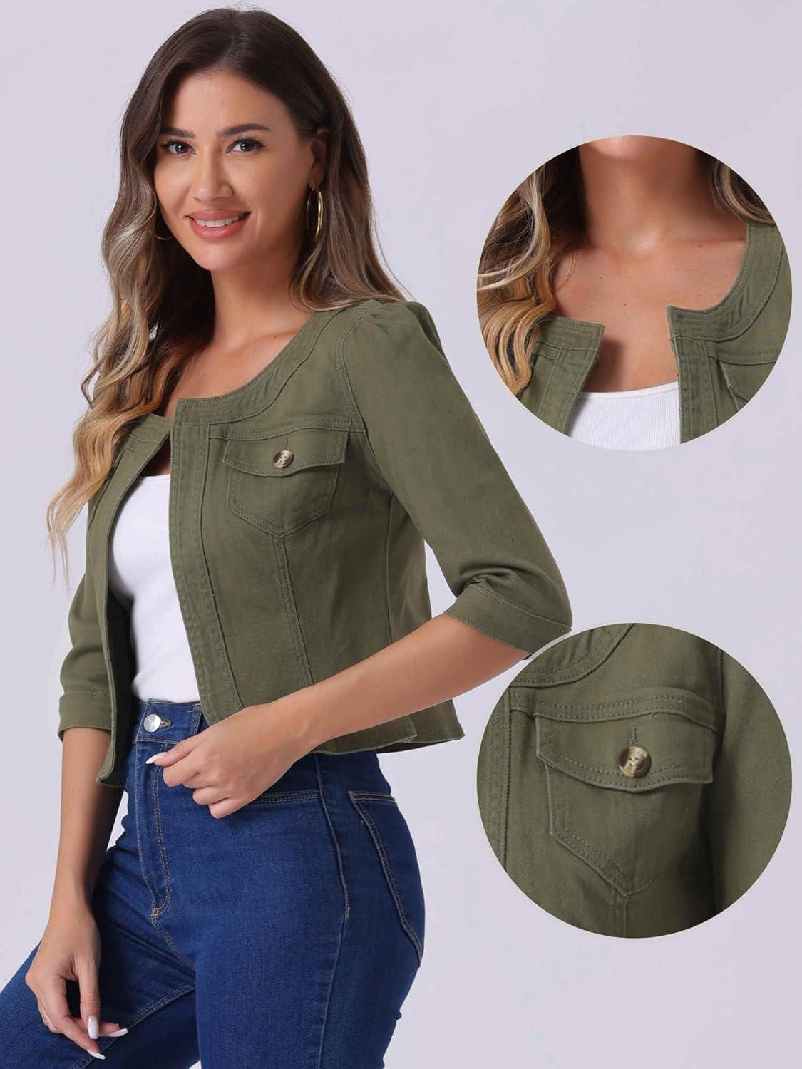 Allegra K Denim Jacket for Women’s Collarless 2025 Cardigan 3/4 Sleeve Crop Jean Jackets(Army Green)