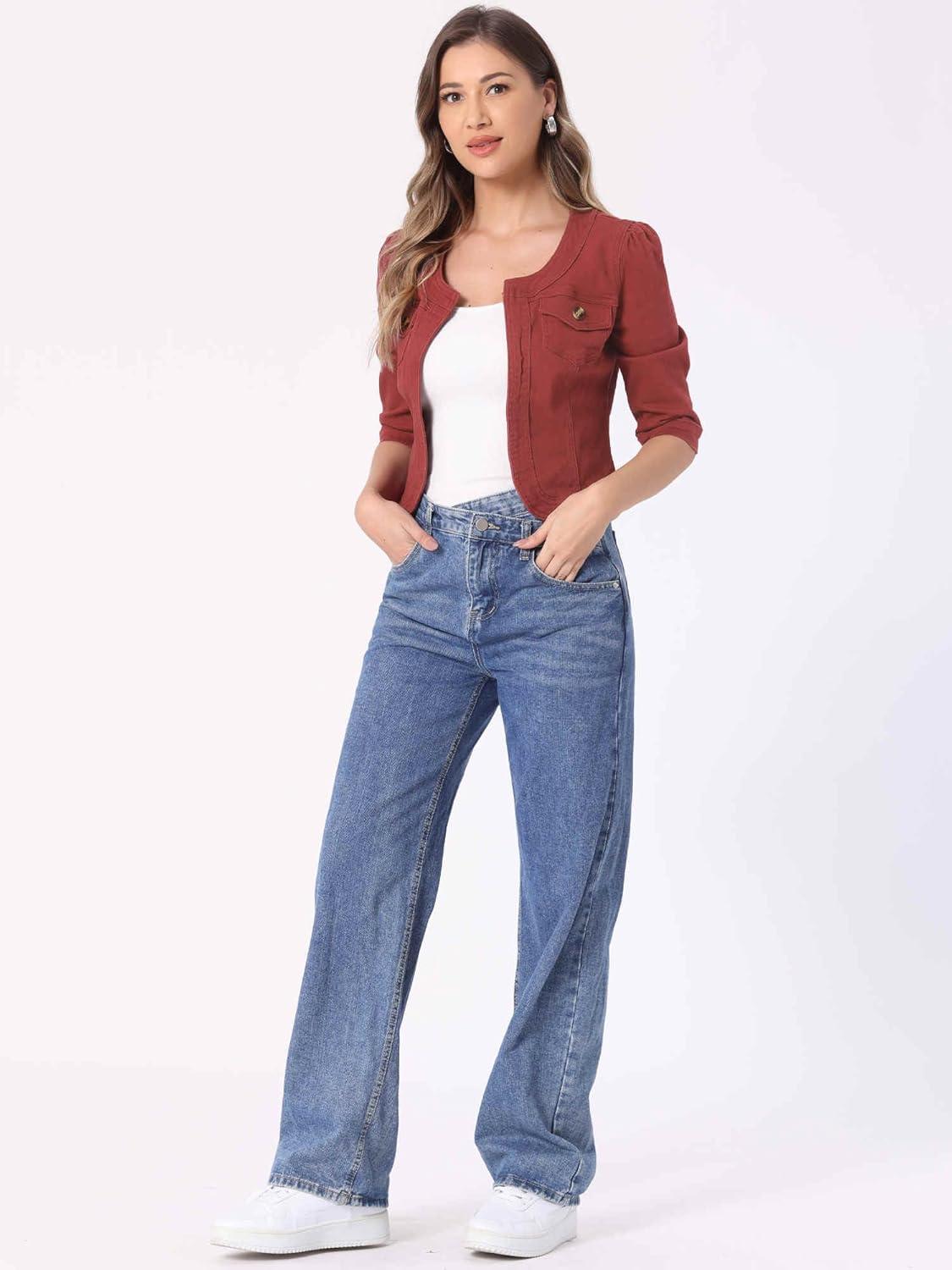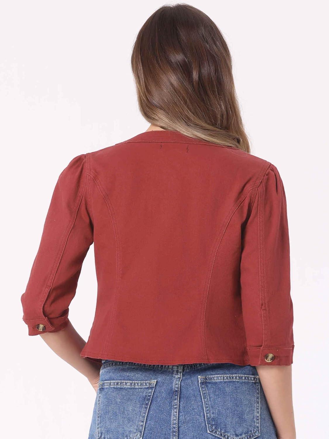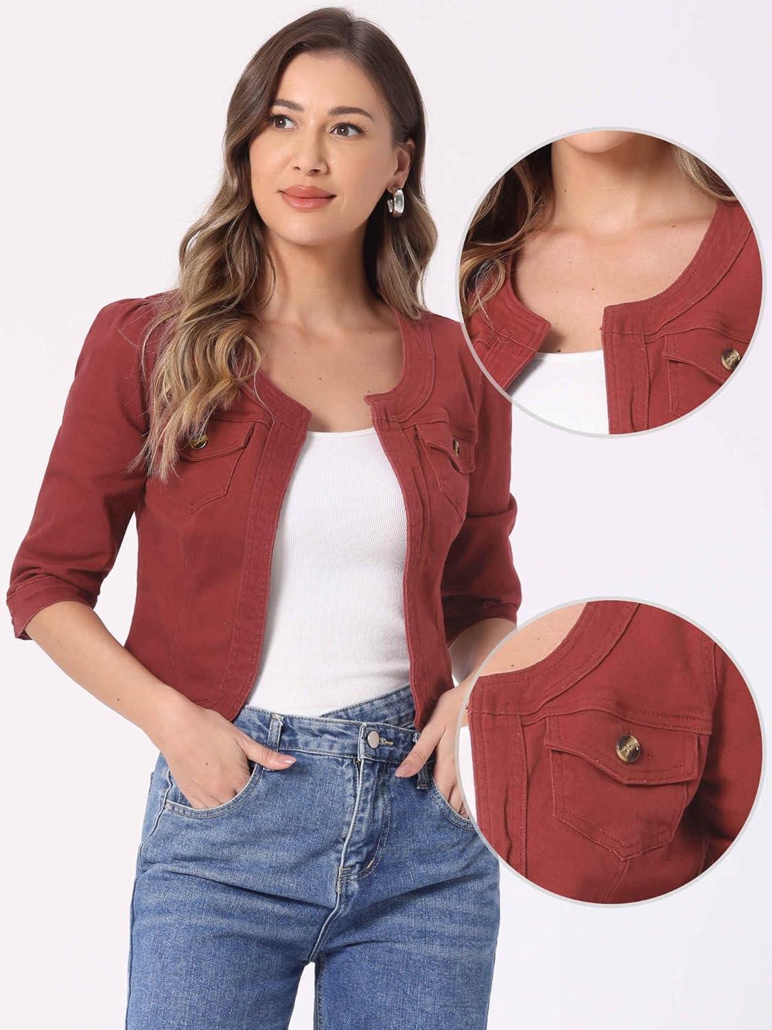 Allegra K Denim Jacket for Women’s Collarless 2025 Cardigan 3/4 Sleeve Crop Jean Jackets(Brick Red)