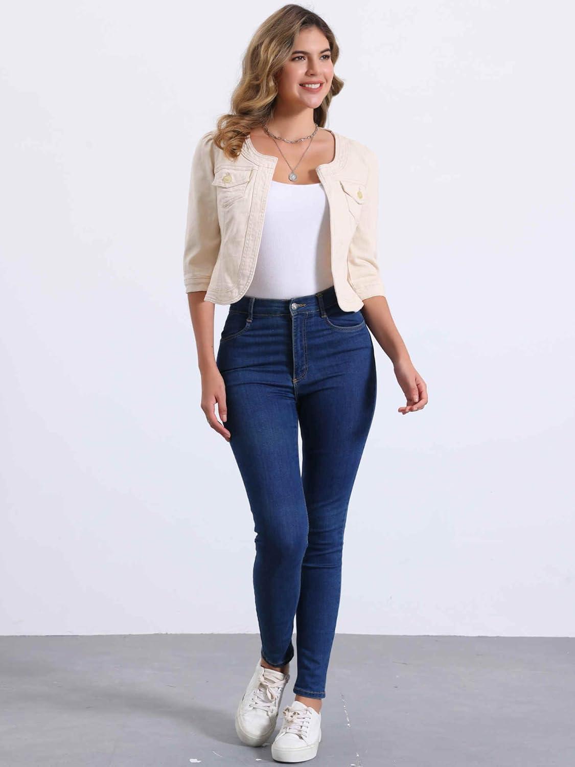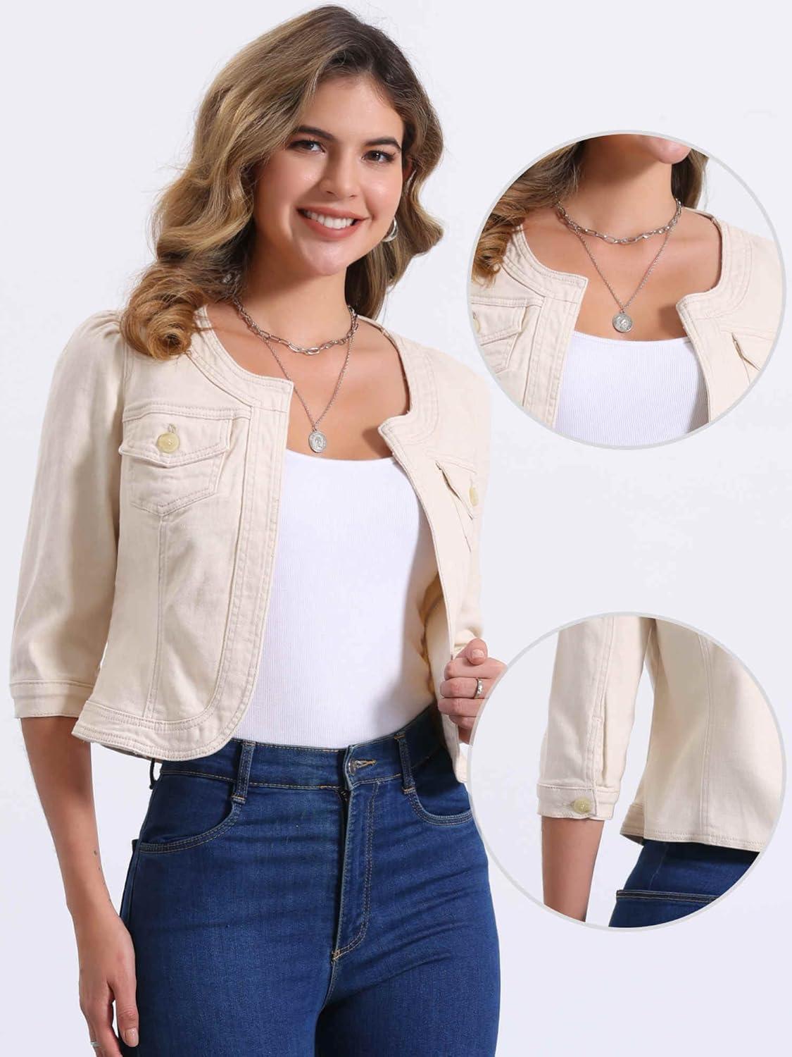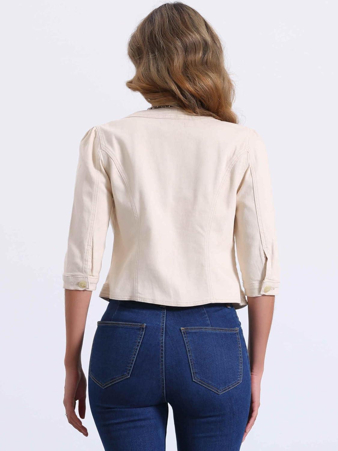 Allegra K Denim Jacket for Women’s Collarless 2025 Cardigan 3/4 Sleeve Crop Jean Jackets(Cream)