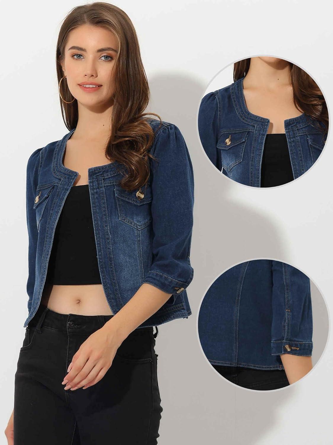 imageAllegra K Denim Jacket for Womens Collarless 2025 Cardigan 34 Sleeve Crop Jean JacketsDark Blue