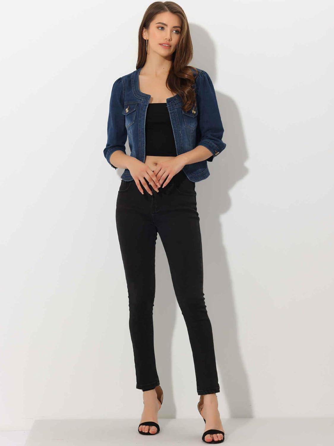 Allegra K Denim Jacket for Women’s Collarless 2025 Cardigan 3/4 Sleeve Crop Jean Jackets(Dark Blue)