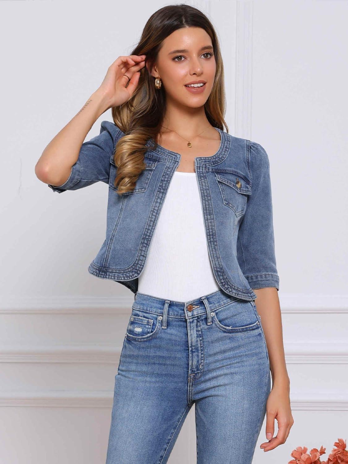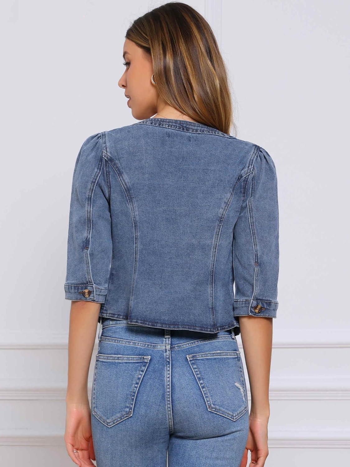 Allegra K Denim Jacket for Women's Collarless 2025 Cardigan 3/4 Sleeve Crop Jean Jackets(Gray Blue)
