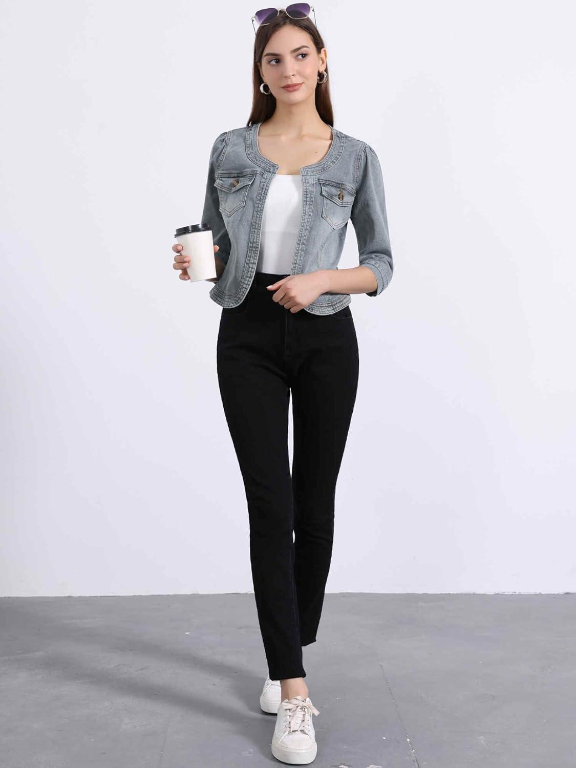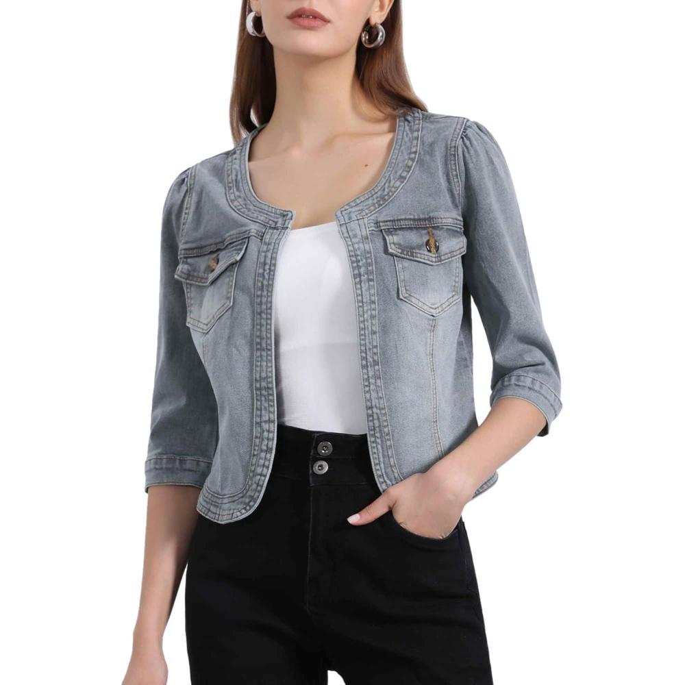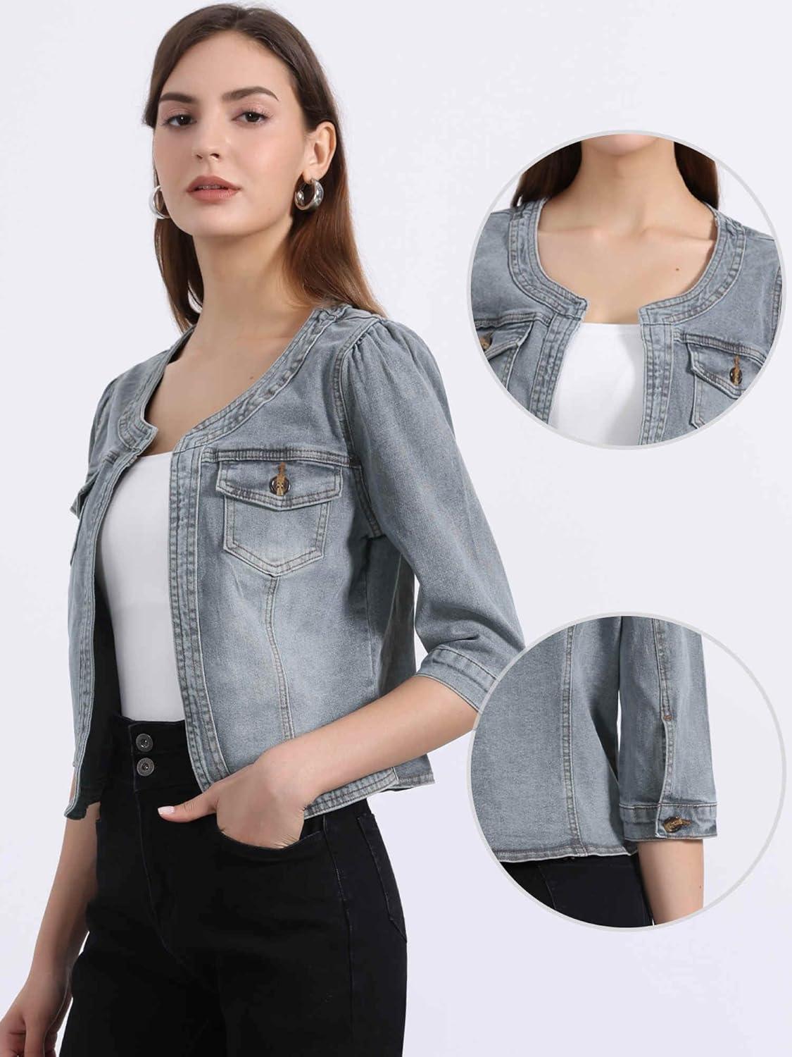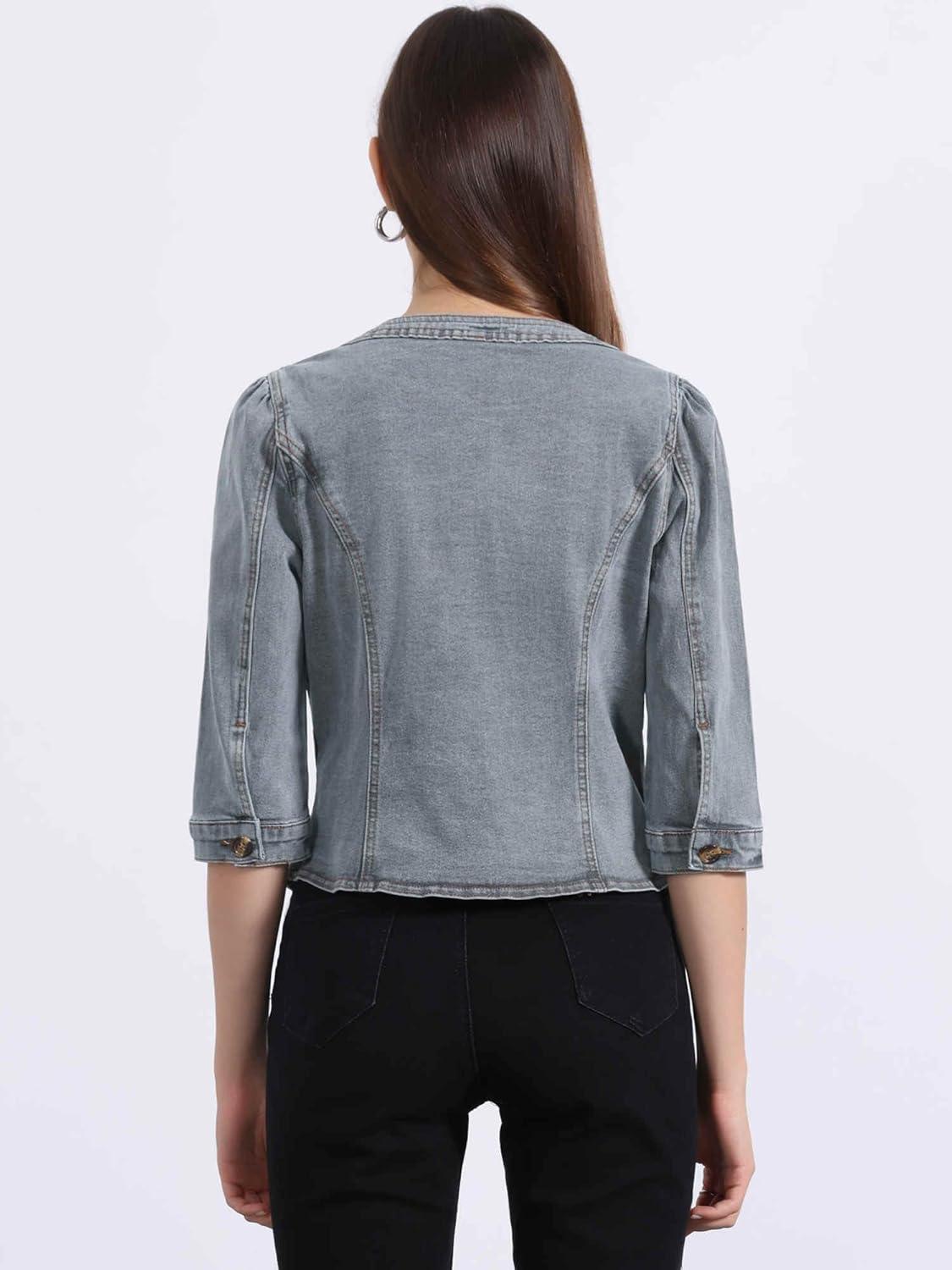 Allegra K Denim Jacket for Women’s Collarless 2025 Cardigan 3/4 Sleeve Crop Jean Jackets(Gray)