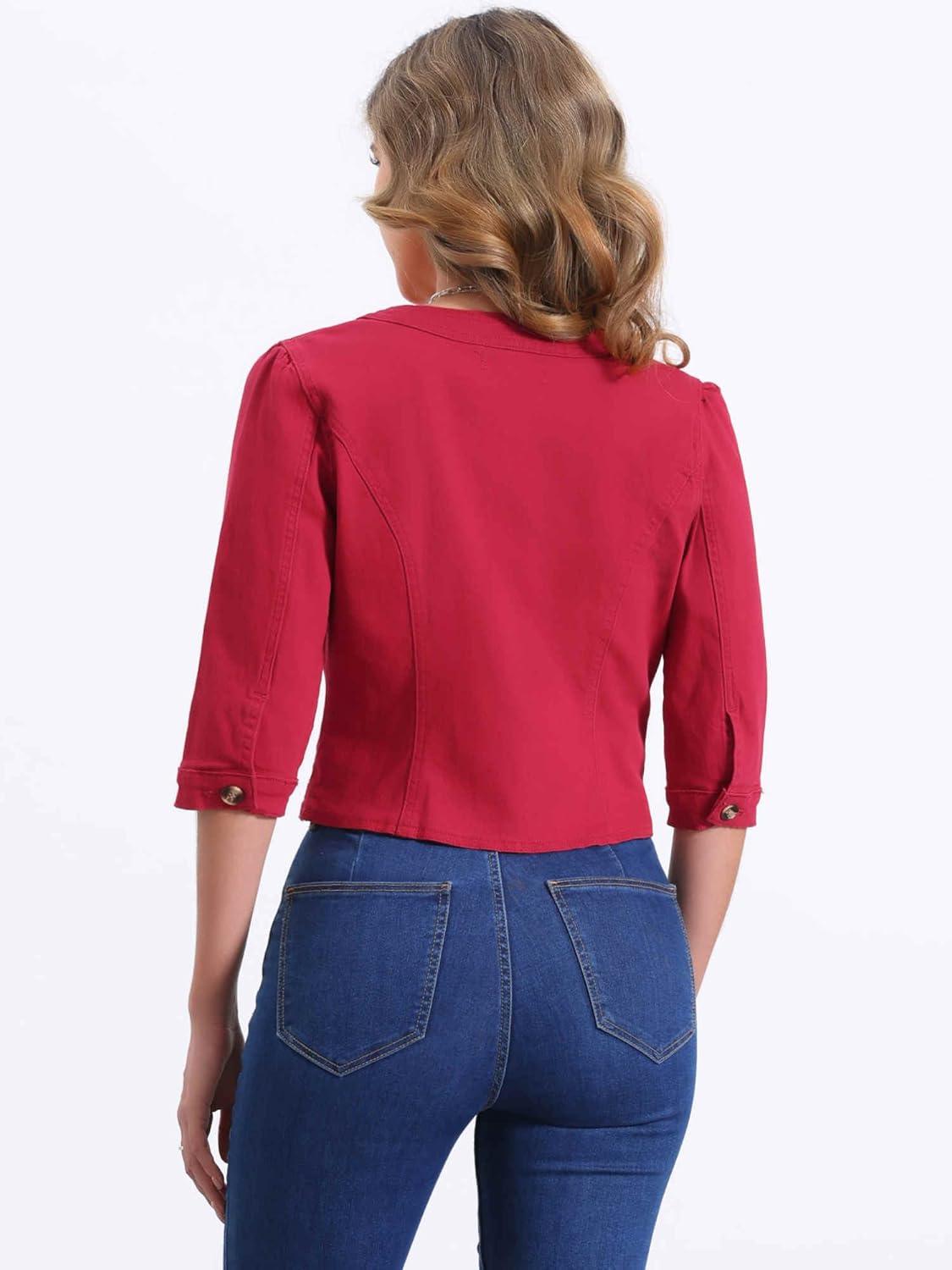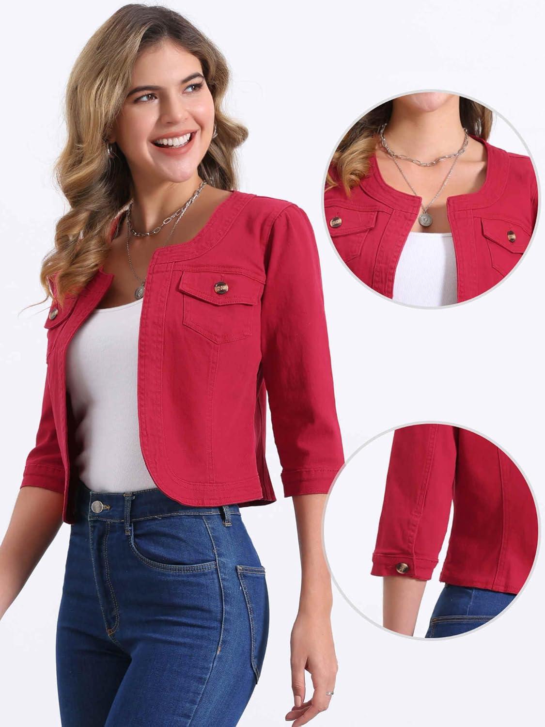 Allegra K Denim Jacket for Women’s Collarless 2025 Cardigan 3/4 Sleeve Crop Jean Jackets(Red)