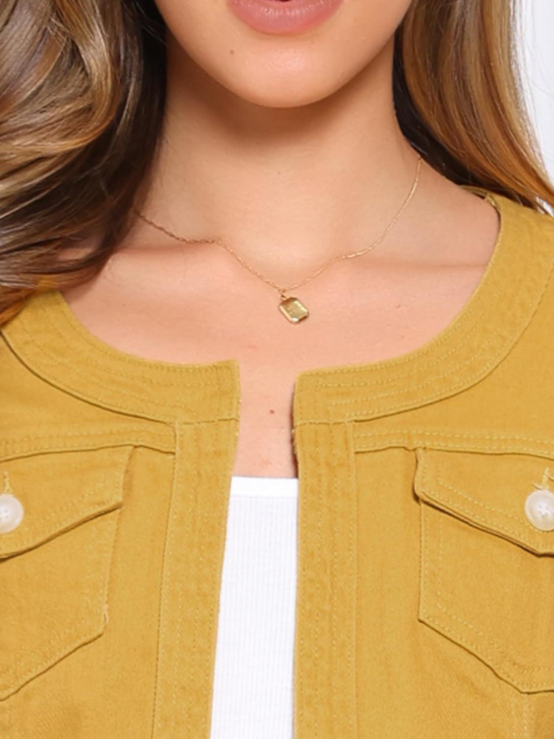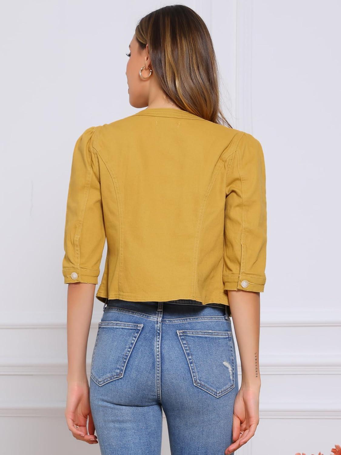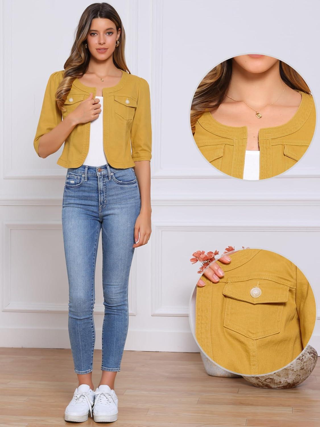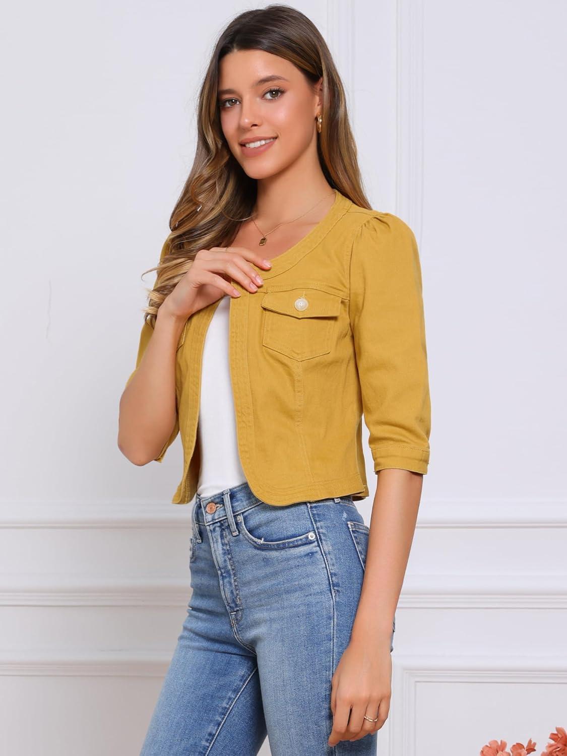 Allegra K Denim Jacket for Women’s Collarless 2025 Cardigan 3/4 Sleeve Crop Jean Jackets(Yellow)