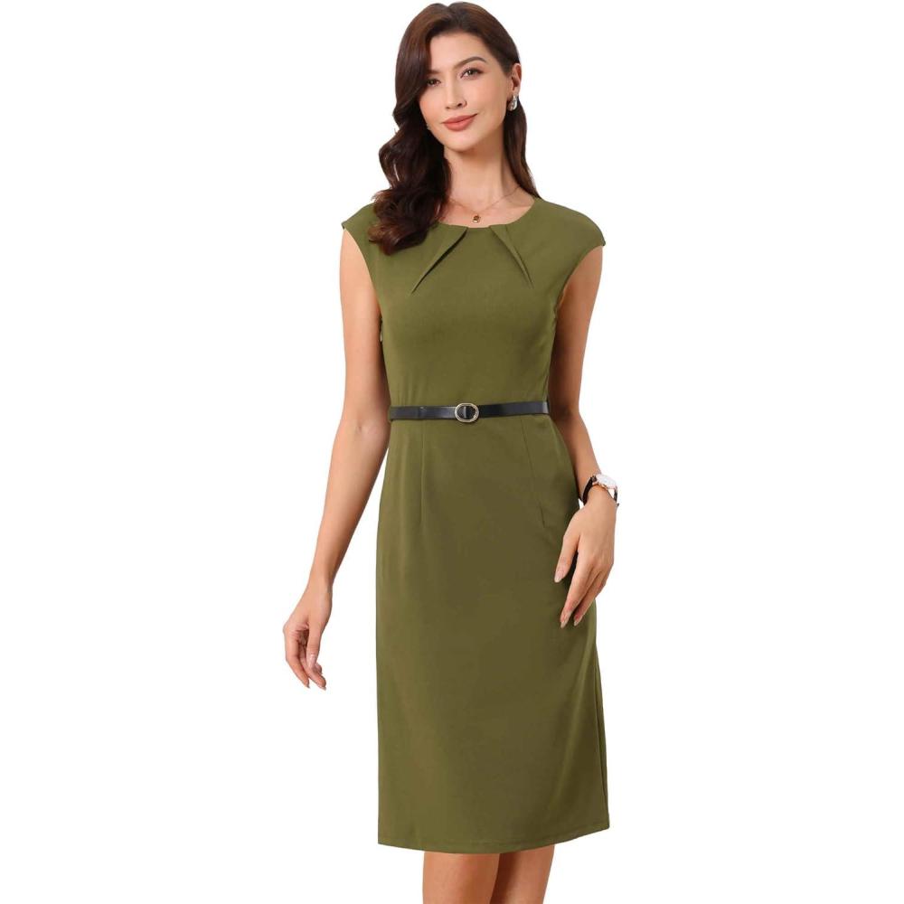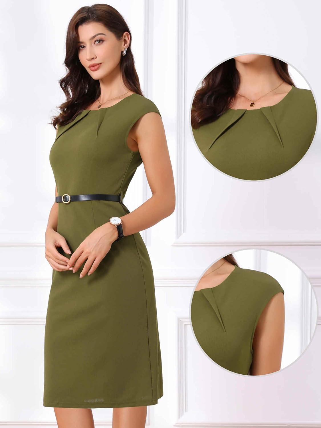 Allegra K Elegant Business Dress for Women’s 2025 Cap Sleeve Belted Wear to Work Sheath Dresses(Army Green)