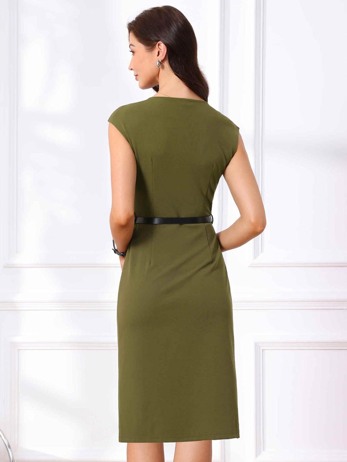 Allegra K Elegant Business Dress for Women's 2025 Cap Sleeve Belted Wear to Work Sheath Dresses(Army Green)