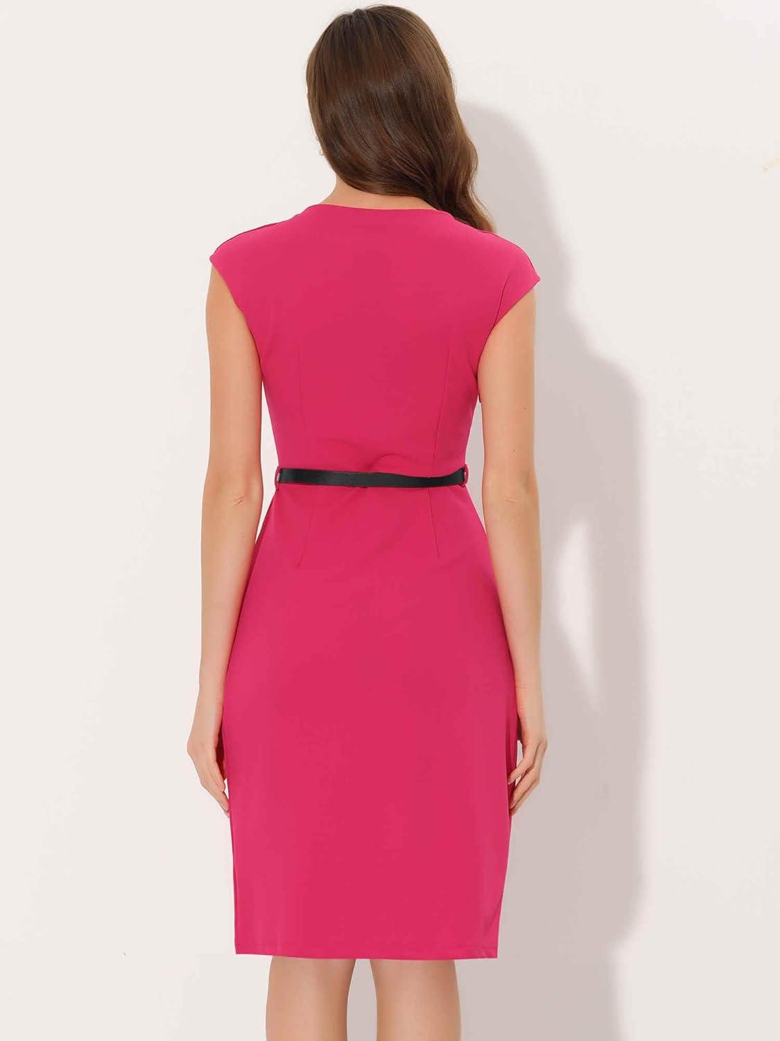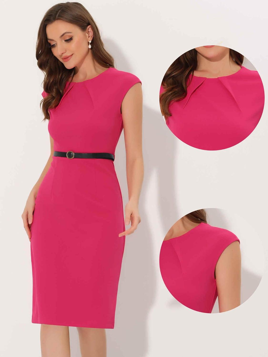 Allegra K Elegant Business Dress for Women's 2025 Cap Sleeve Belted Wear to Work Sheath Dresses(Hot Pink)