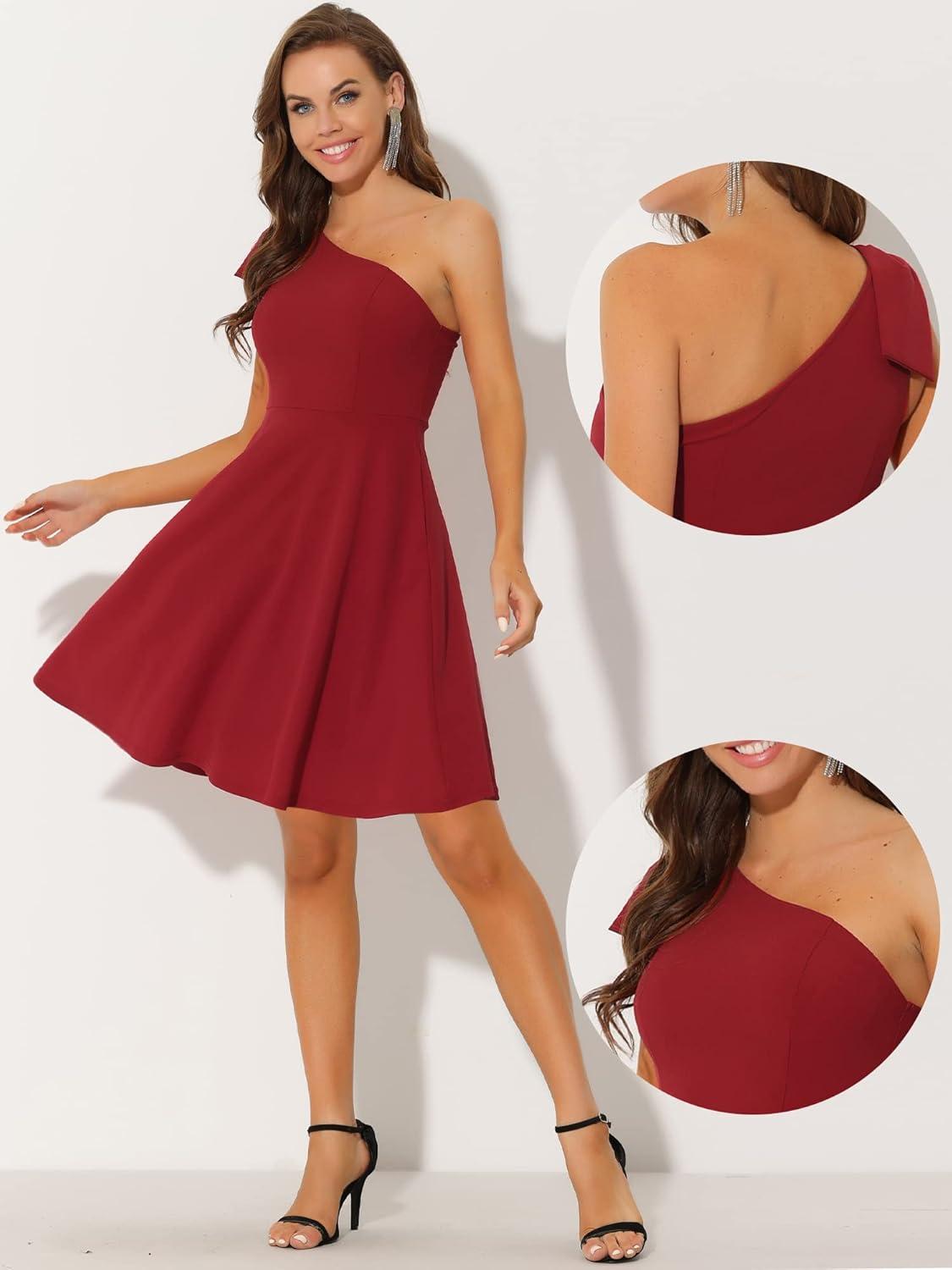 Allegra K Evening Cocktail Dress for Women’s Party Elegant Flared One Shoulder Formal Dresses(Red)