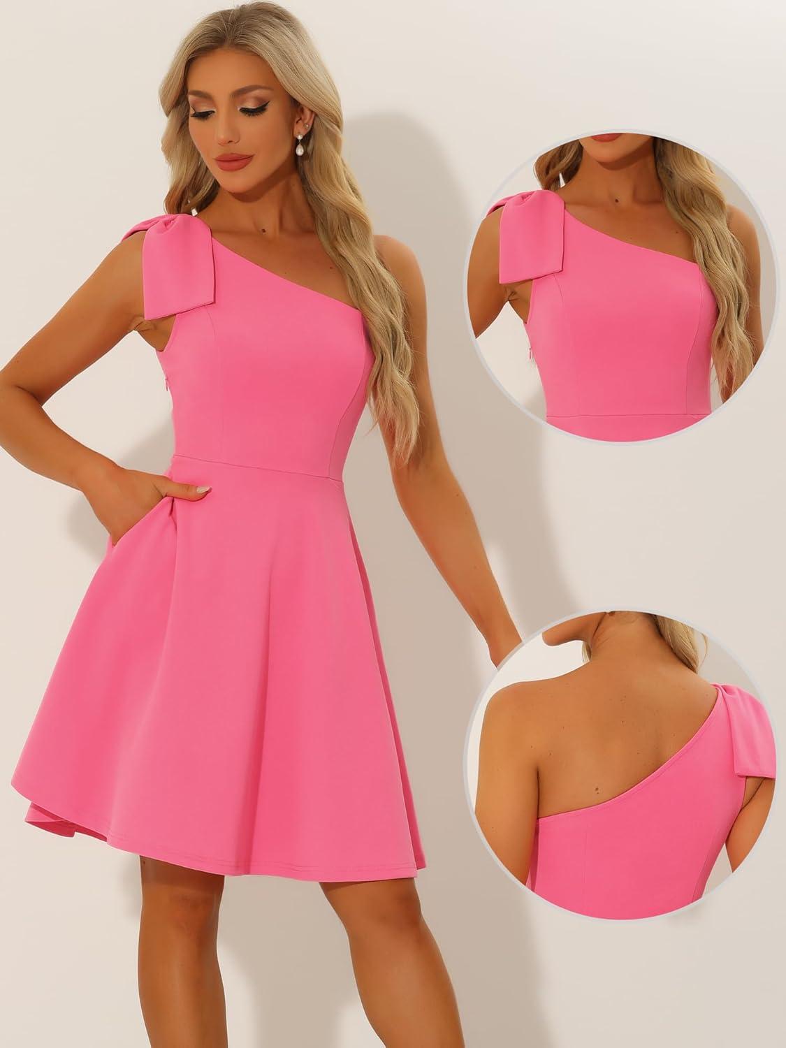 Allegra K Evening Cocktail Dress for Women’s Party Elegant Flared One Shoulder Formal Dresses(Shiny Pink)