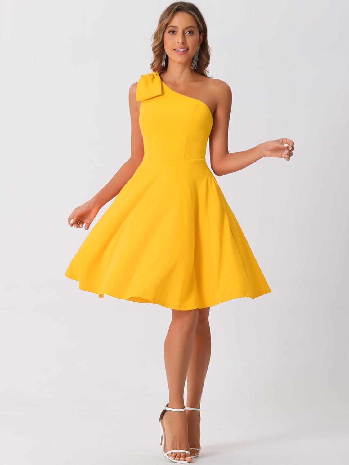 Allegra K Evening Cocktail Dress for Women’s Party Elegant Flared One Shoulder Formal Dresses(Yellow)