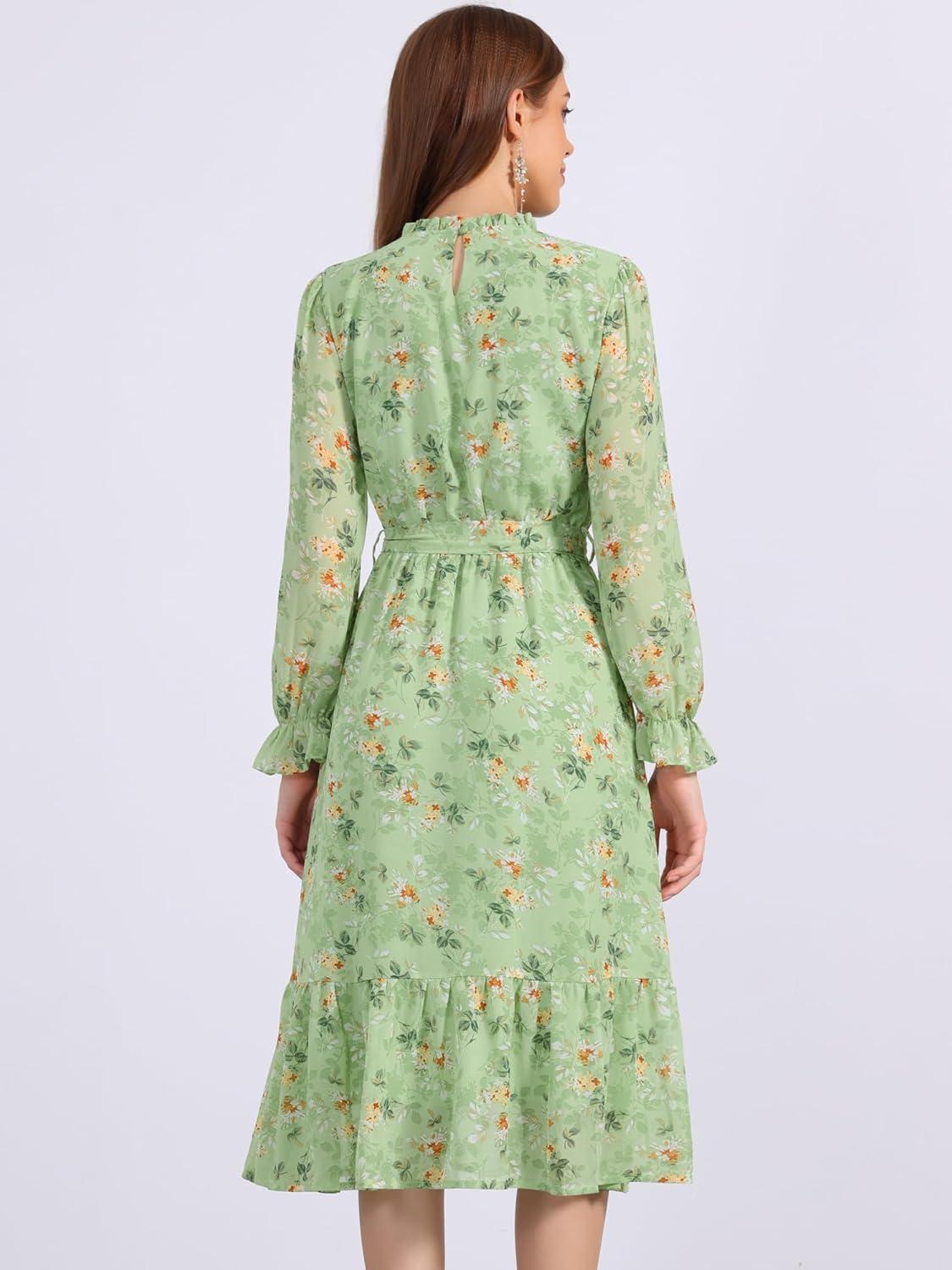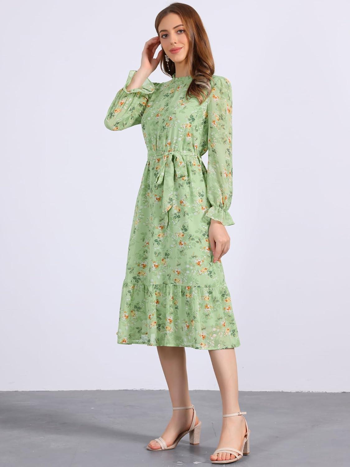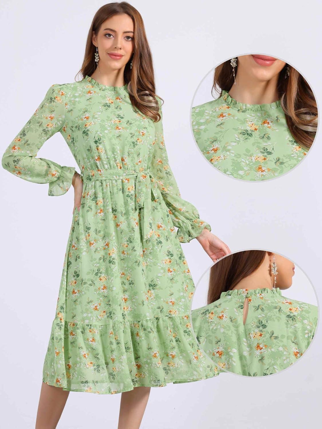 Allegra K Fall Casual Floral Dress for Women 2025 Long Sleeve Crew Neck Chiffon Midi Tea Party Ruffle Dresses(Green)