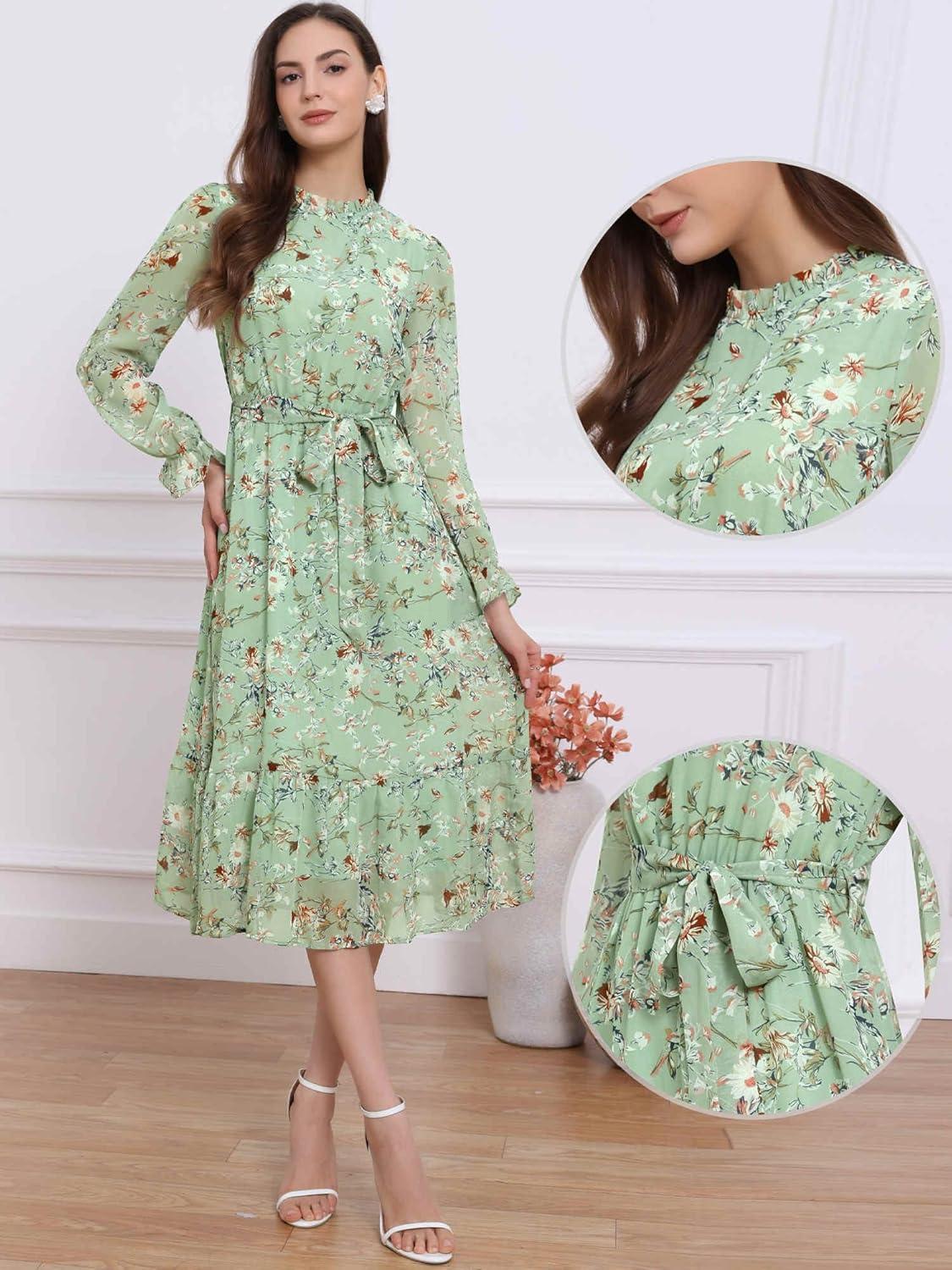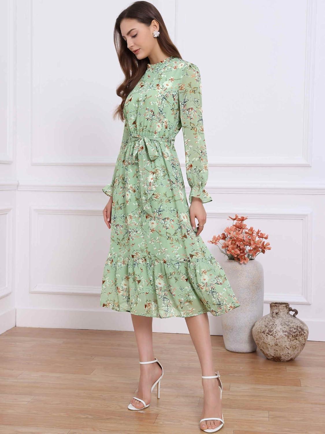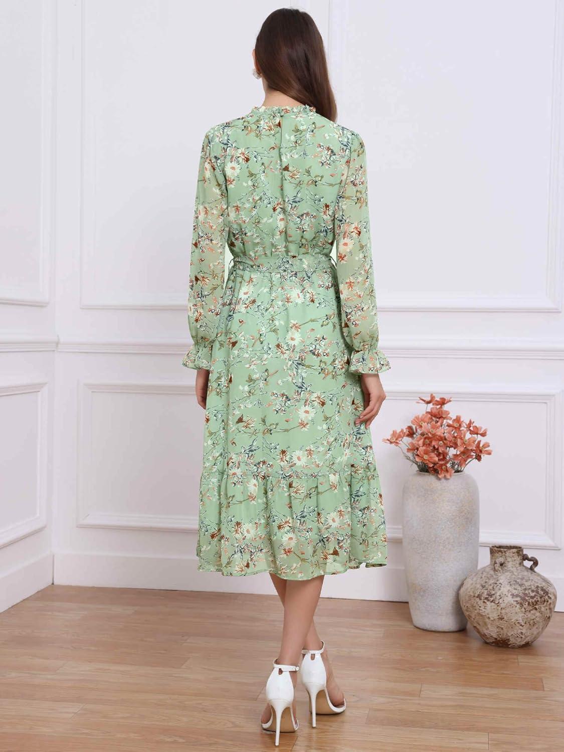 Allegra K Fall Casual Floral Dress for Women 2025 Long Sleeve Crew Neck Chiffon Midi Tea Party Ruffle Dresses(Grey Green)