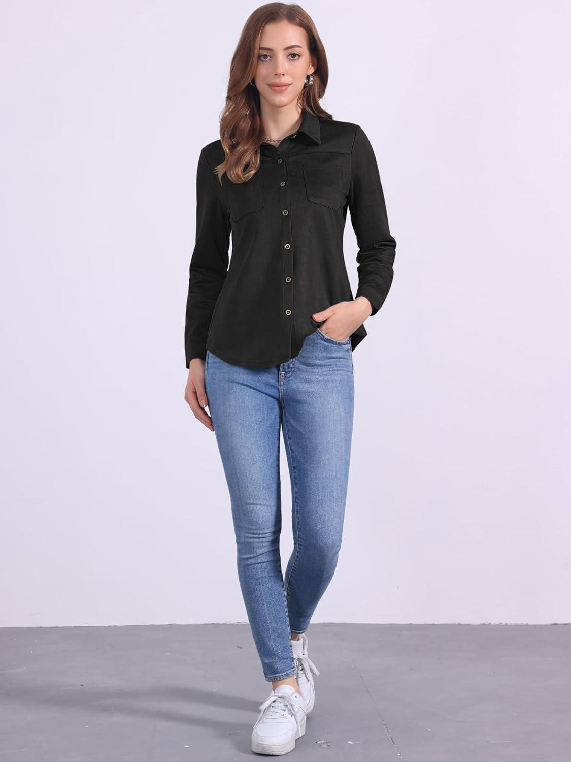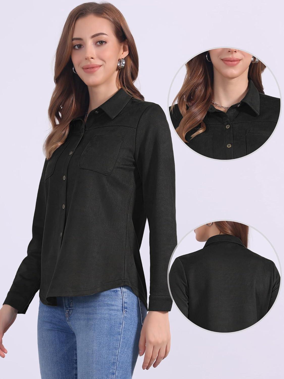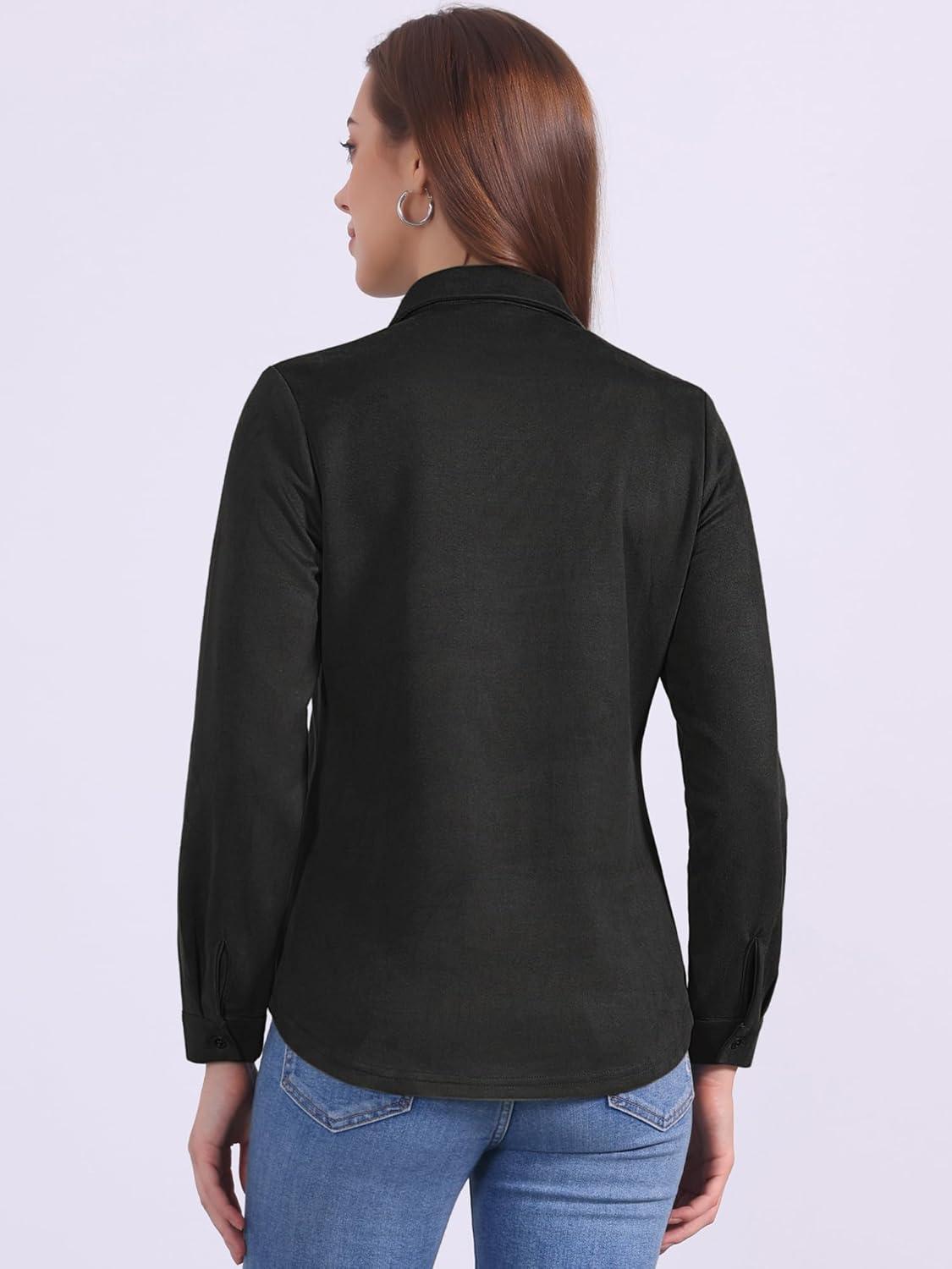 Allegra K Faux Suede Shirt for Women’s Stretch Dressy Casual Button Down Long Sleeve Shirt 2024 Fall Clothes(Black)