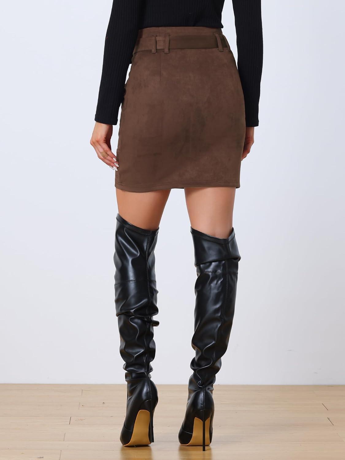 Allegra K Faux Suede Skirt for Women’s High Waist Casual Belted Pencil Skirts(Dark Brown)