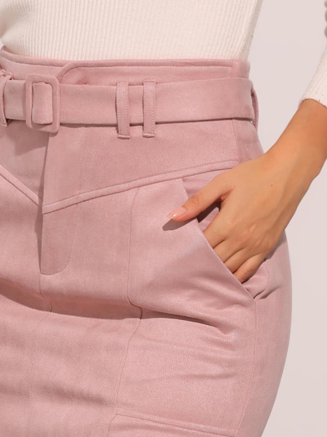 Allegra K Faux Suede Skirt for Women's High Waist Casual Belted Pencil Skirts(Pink)