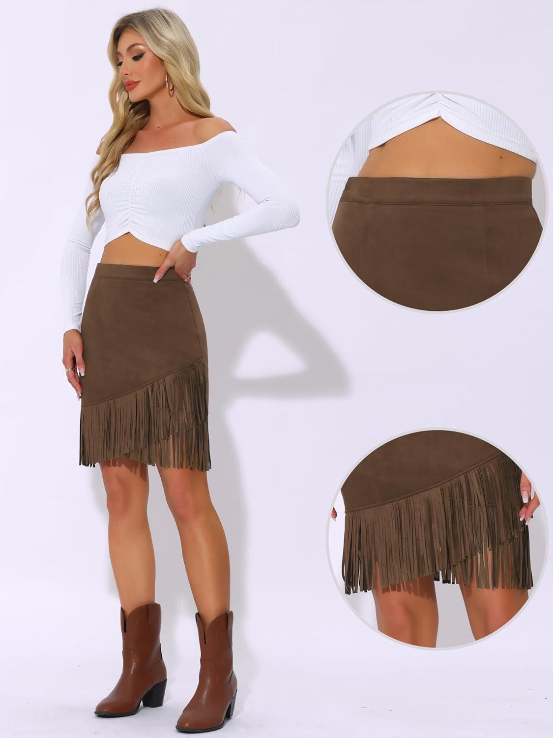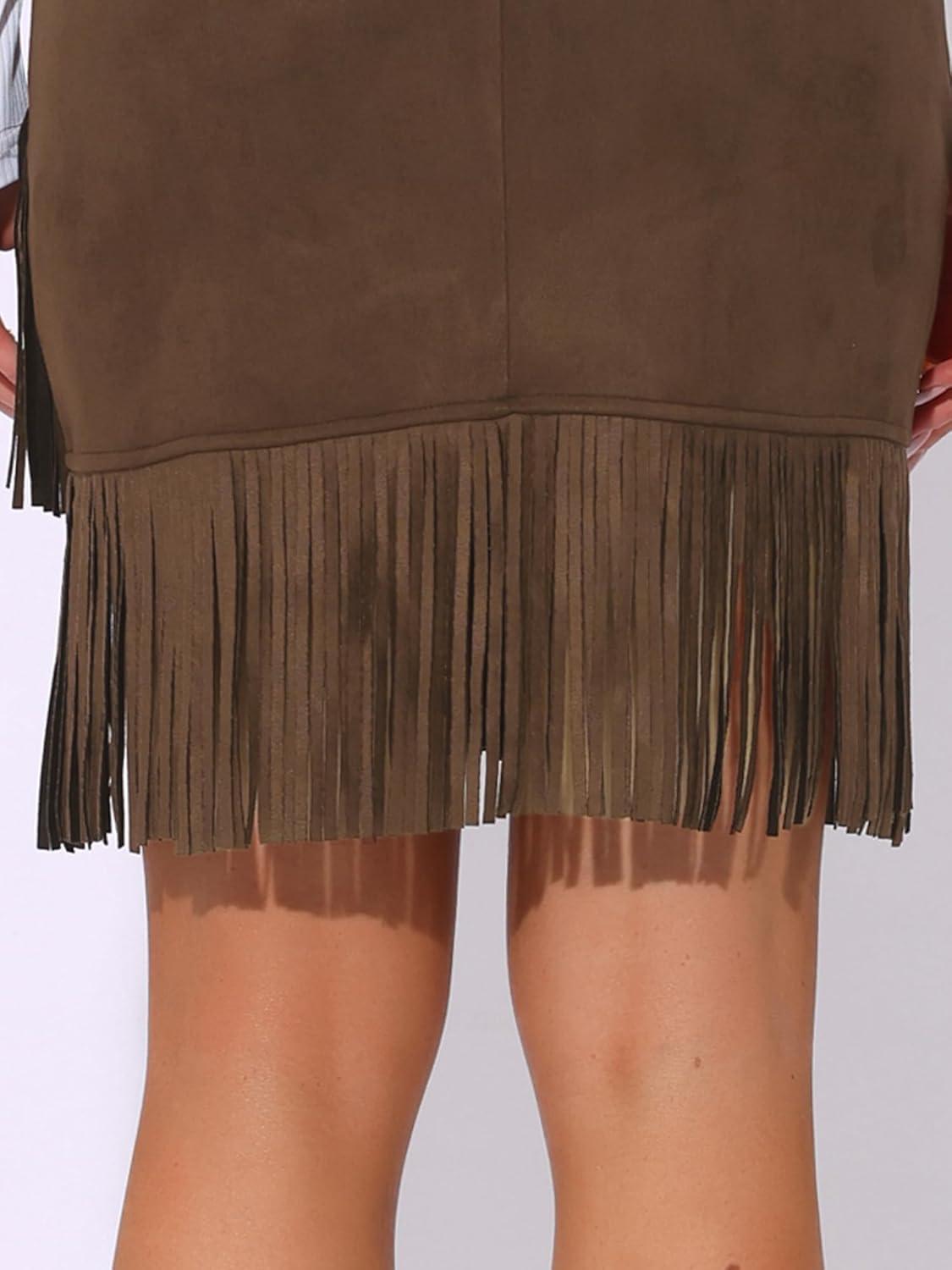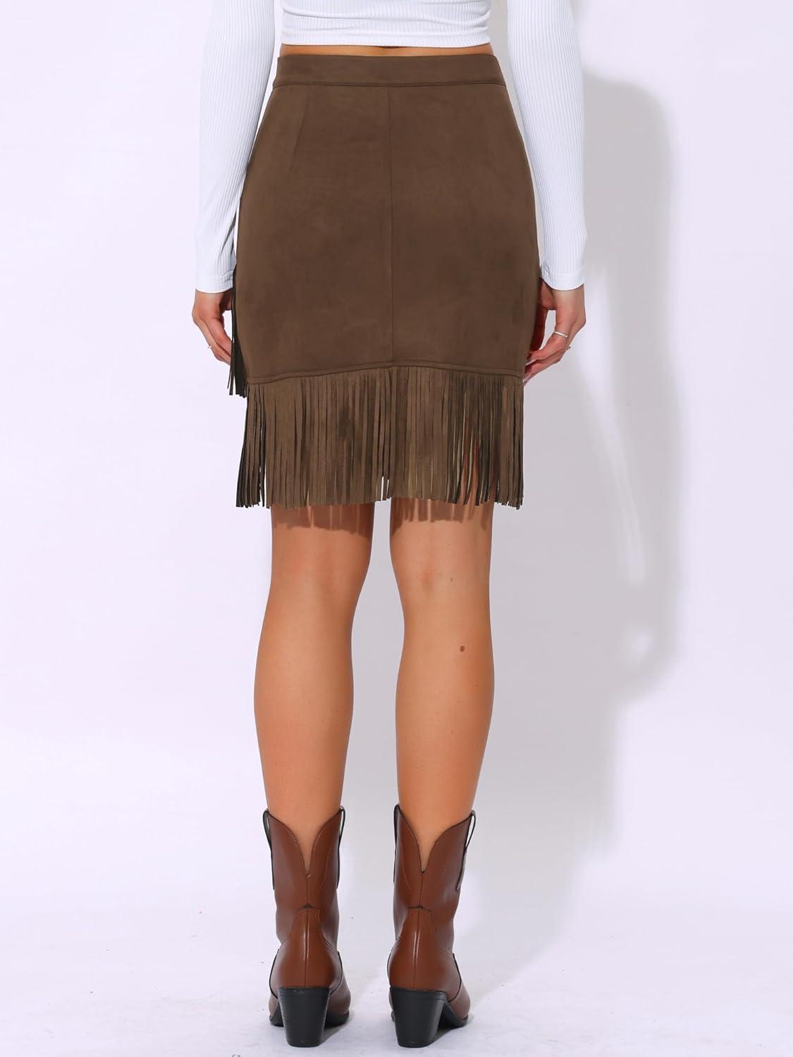 Allegra K Faux Suede Skirt for Women's Vintage High Waist Fringe Trim Stretch Bodycon Mini Skirts(Dark Brown)