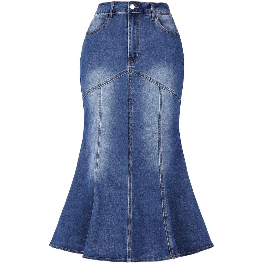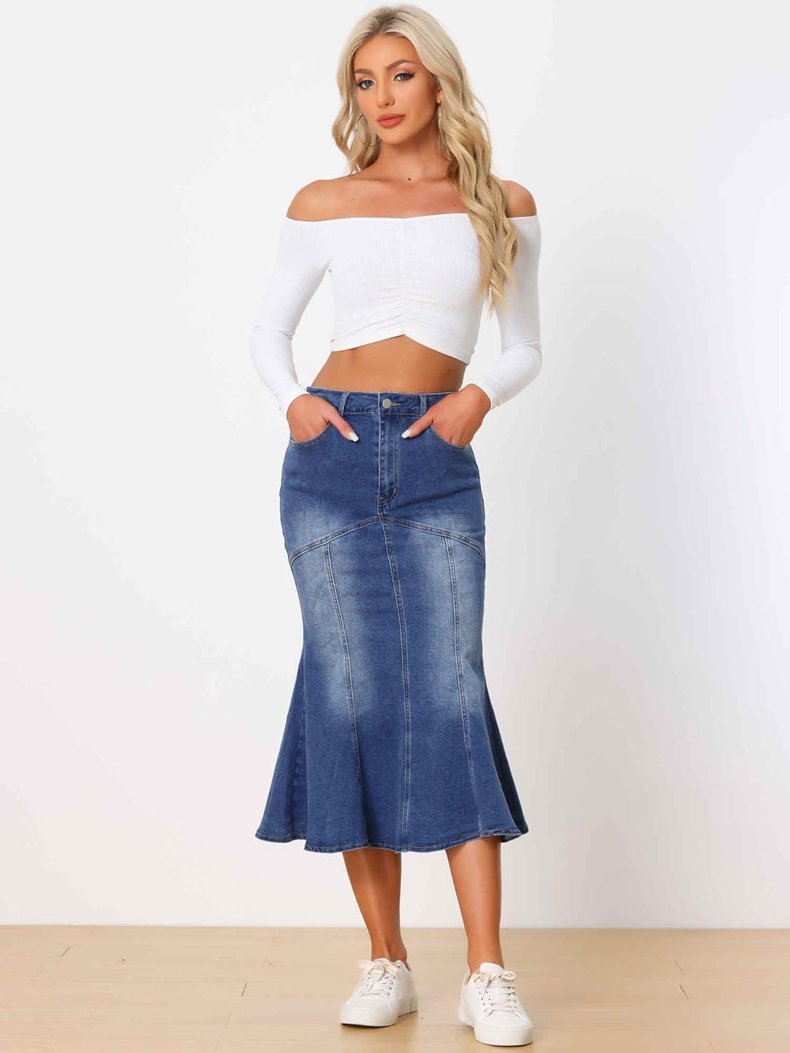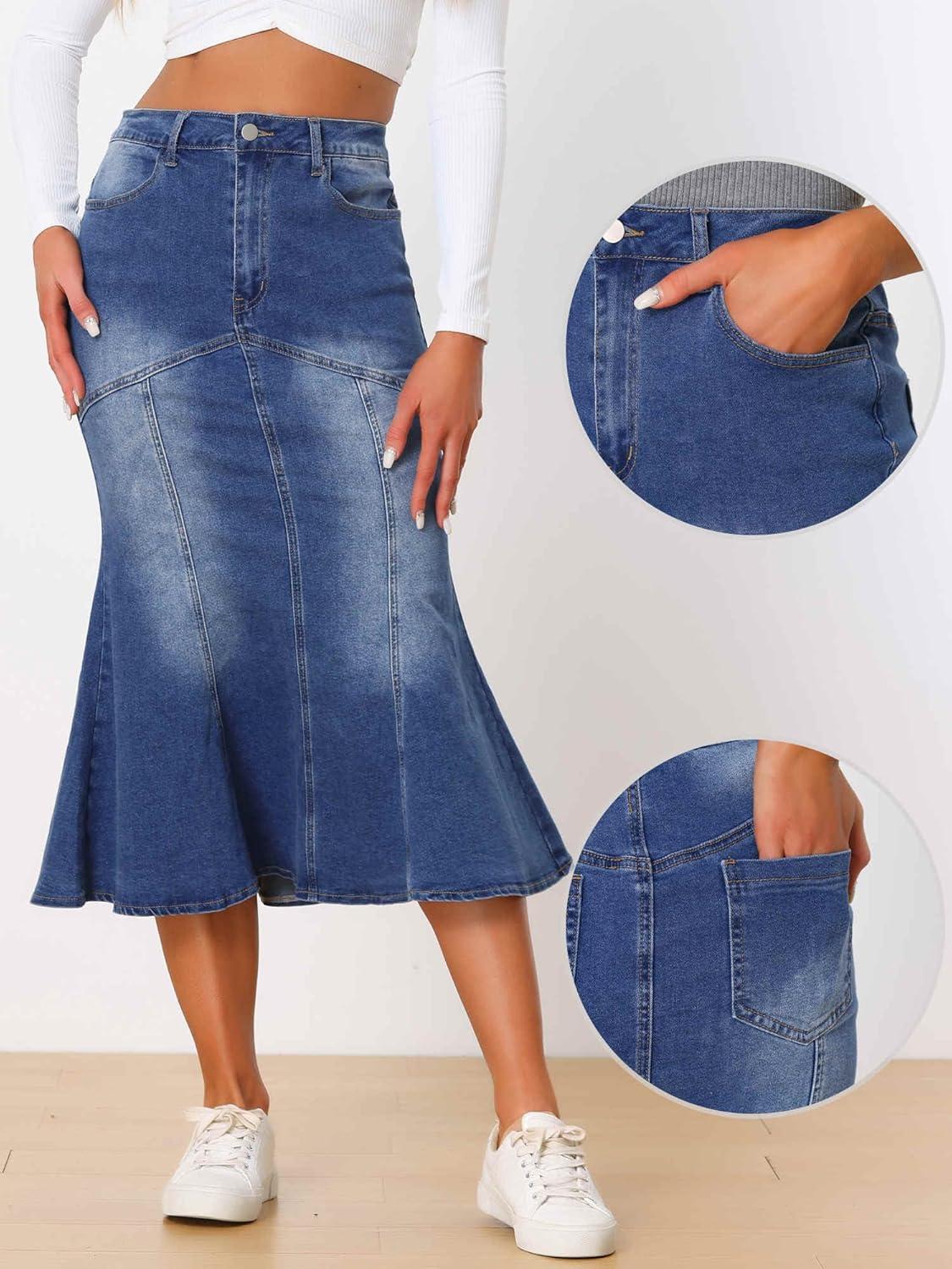 Allegra K Fishtail Denim Skirt for Women Casual Washed High Waisted Midi Jean Skirts(Blue)