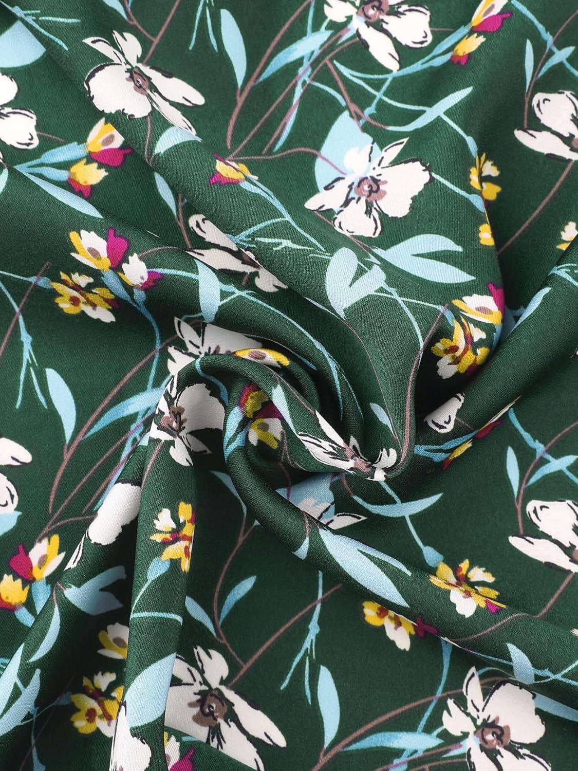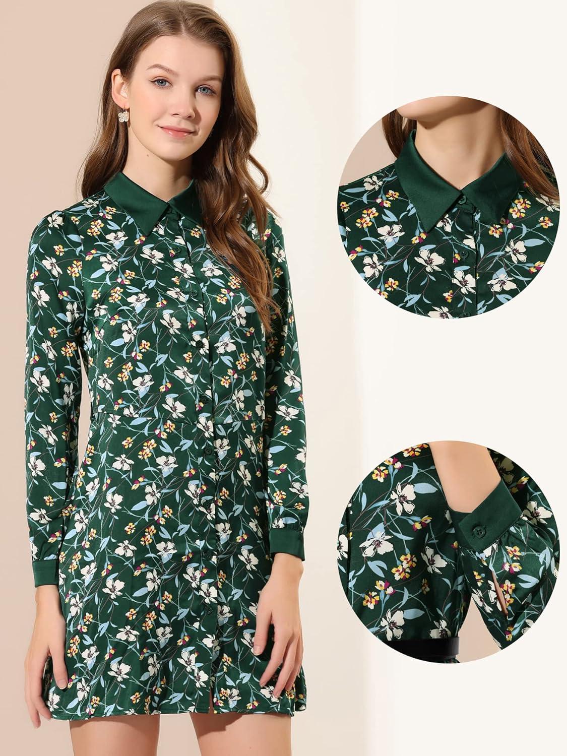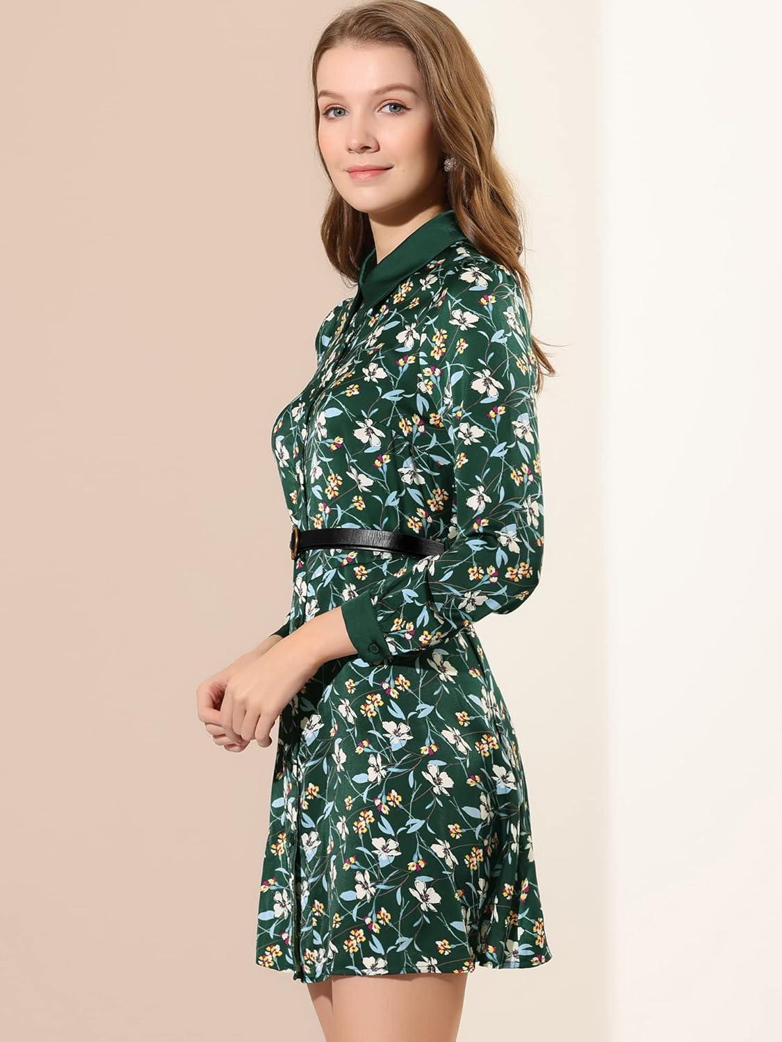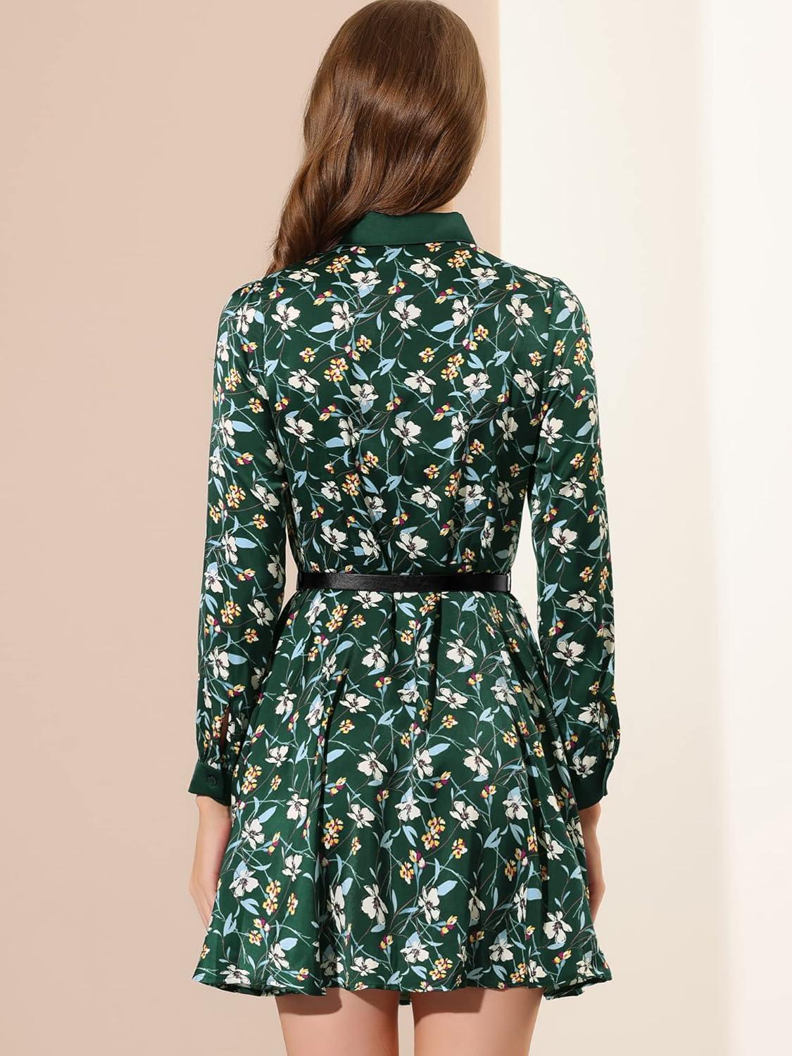 Allegra K Floral Satin Dresses for Women’s Spring Fall Long Sleeve Belted Button Down Dress(Dark Green)